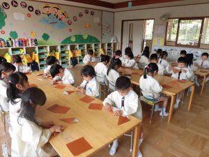 今日から本格的に各クラス活動が始まってきました。ひまわり組はいよいよ明日筍掘りへでかけます。今日は期待を込めて筍を折り紙で、たんぽぽ組さんは鯉のぼり製作、ちゅうりっぷ組さんは背の順並びを行うための準備身体測定を行いました。それぞれに各クラス落ち着いて活動を行っていました。