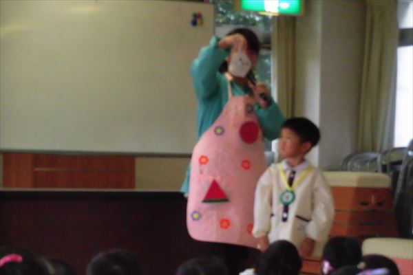 今日の先生のお楽しみ(出し物)はエプロンシアターでクイズを行いました。