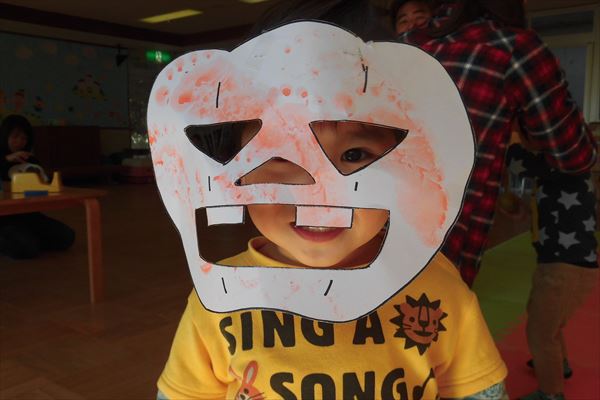 今日は『ハッピーハロウィン!?』っと言う事で子どもの足型?でかぼちゃのお面を作りました。初めての経験でと戻っていた様子も有りましたが、これも子ども達にとっては貴重な経験ではないかと思います。最後はお面をかぶって『トリックオアトリート