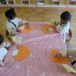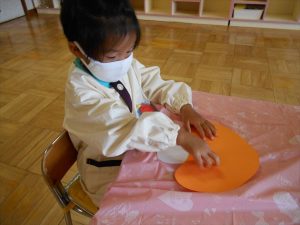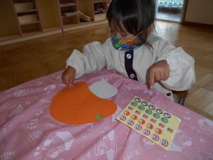 ひよこ組が始まって今日で5日目です。朝お母さんから離れるときは寂しくて泣けてしまう事も有りますが、お部屋の中ではそんなことないですよ。今日はトンボや、キノコなどなどの製作活動を集中して行っていました。そんな様子を覗き見です。
