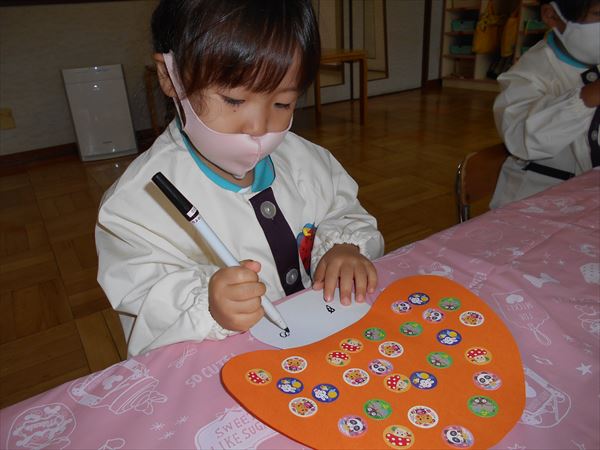 シール張りをして、キノコに飾りを付け、ラッションペンでお顔を描いて可愛いキノコちゃんが完成です。