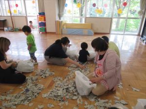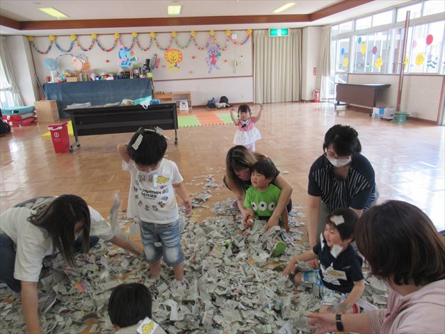 新聞紙を沢山ちぎってみんなでシャワーみたいに掛け合いっこ何度も何度も掛け合いをして笑顔いっぱいの子どもたちでした