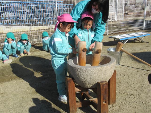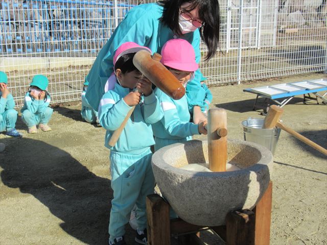 今日は幼稚園でお餅つきを行いました