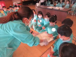 初めに先生のお話しを聞き各クラス順番にお餅をつきました。
