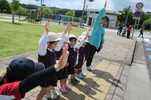 「信号は何色になったら歩けるかな?」「チカチカしたら歩いてもいいのかな?」など信号機の見方や渡る時には横断歩道の手前で一度きちんと止まり「手を挙げて!右・左・右・車良し!」と確認してから出発する等、横断歩道の渡り方を教えてもらいました。