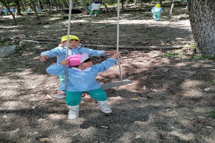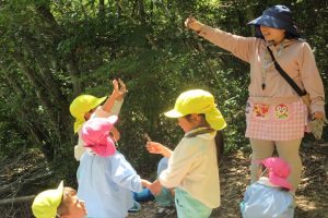 「袋の中に入っているものを探してきてね」と恐る恐る袋に手を入れ「木の枝かな・・」と感触で物を当てたり、シダの葉っぱ・ほうばの葉っぱの紙飛行機を教えてもらい高い崖から飛ばしたり・・など自然物を使った遊びや上のお姉さん・お兄さんが小さなお友達と手を繋ぎ山を歩き段差や急な坂があると「危ないよ」と優しく教えてあげる姿や友達の目線に合わせてお話しするなど優しい様子がたくさん見られました