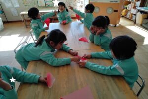 「はじめはアイスのコーンの形を作るよ!」と伝えると「イチゴ味のコーンだね」と見立てたり、「簡単にできるよ」「○○君わかる?この線に合わせて折るんだよ」と困っているお友だちに優しく声を掛ける姿が見られました
