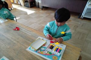 折り終わったら、次は好きな色を選び自分たちだけで折り紙に挑戦‼覚えている所はスイスイと折れていましたが、「あれ?」と思う所があると、「どうしたらよかったっけ?」「どうやって折る?」と机のお友達に聞いて助け合いながらたくさんのサンタさんが出来上がりました