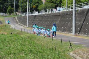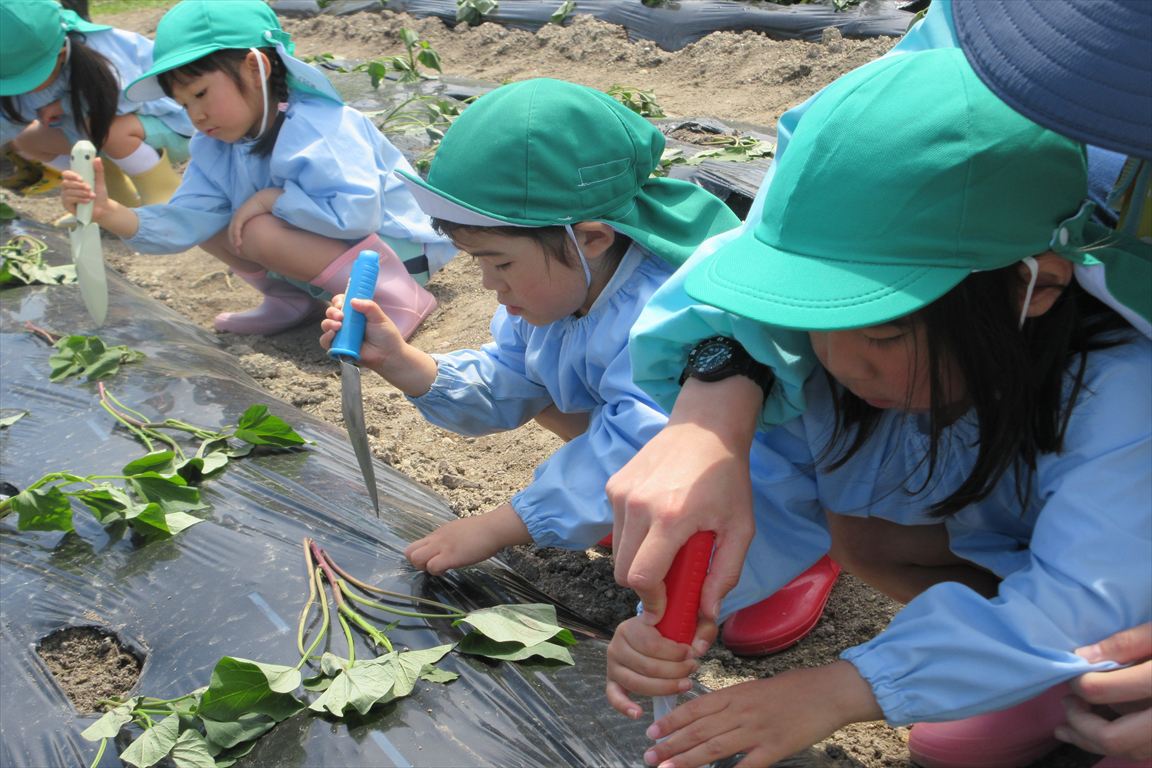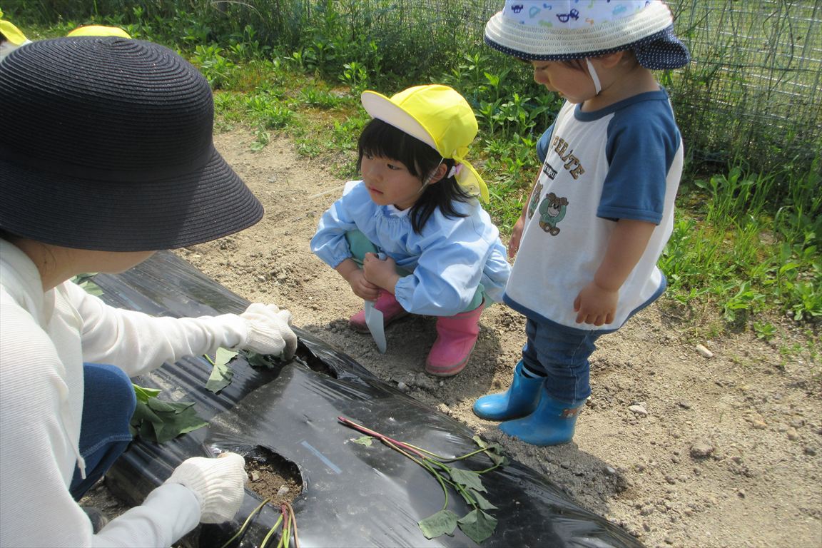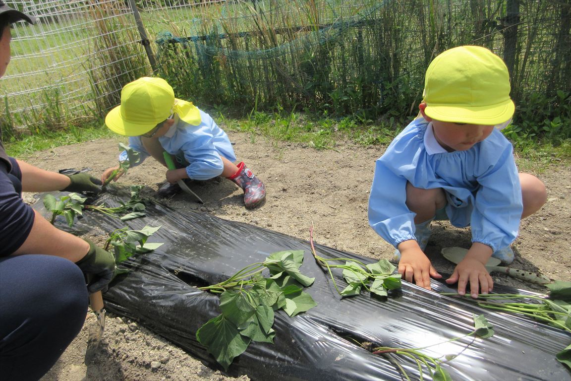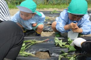 秋のさつまいもの収穫に向けて、全園児で芋の苗を植えに行きました。