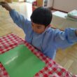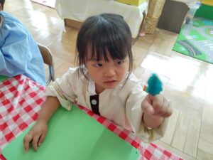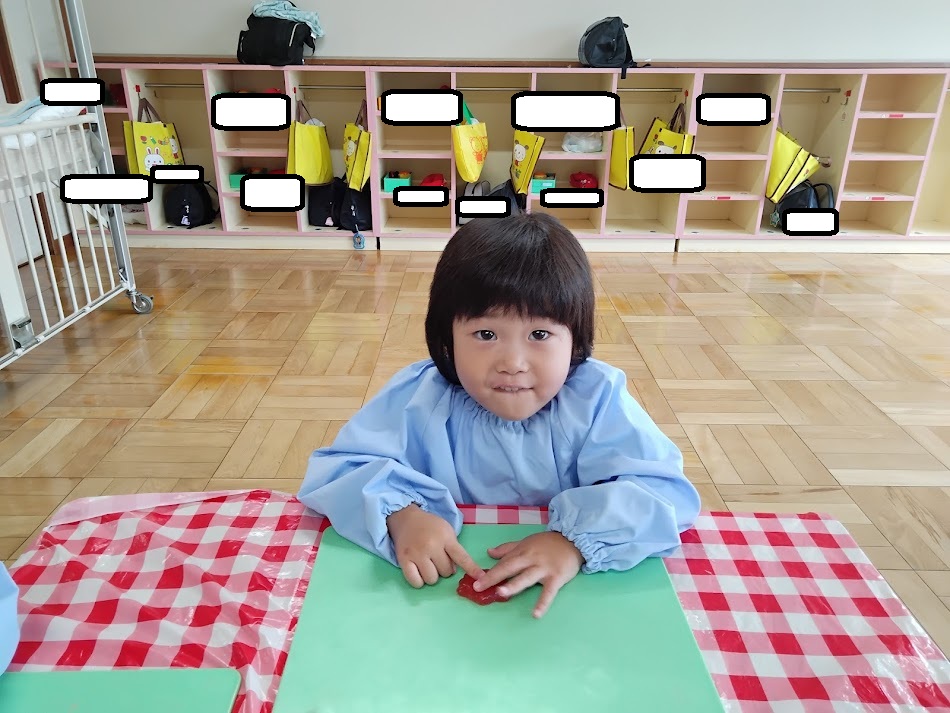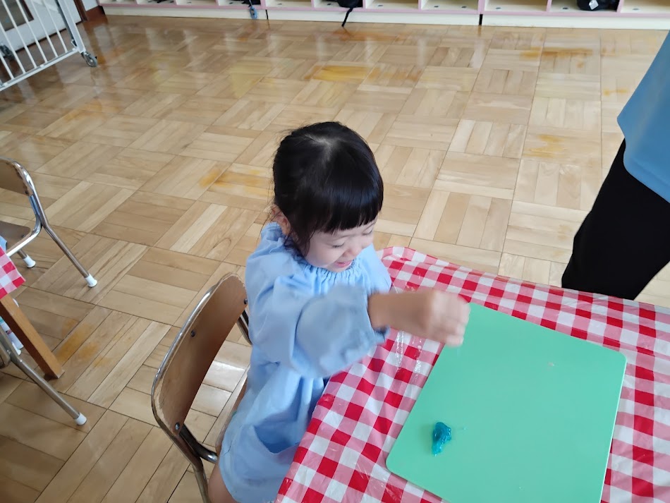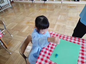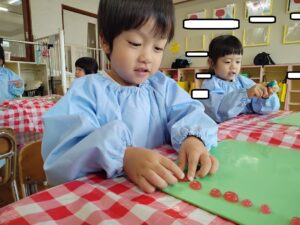 「見て!伸びたよ!」「いちご作ったよ!」と笑顔で楽しそうな子ども達。びよーんと長く伸ばしたり、くるくる伸ばして並べたりそれぞれ楽しんでいる姿が見られました