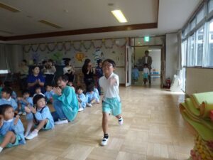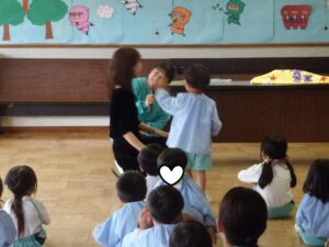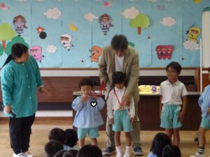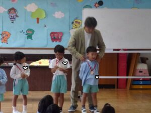 歌のプレゼントの次は、園長先生からのメダルのプレゼント🏅