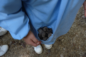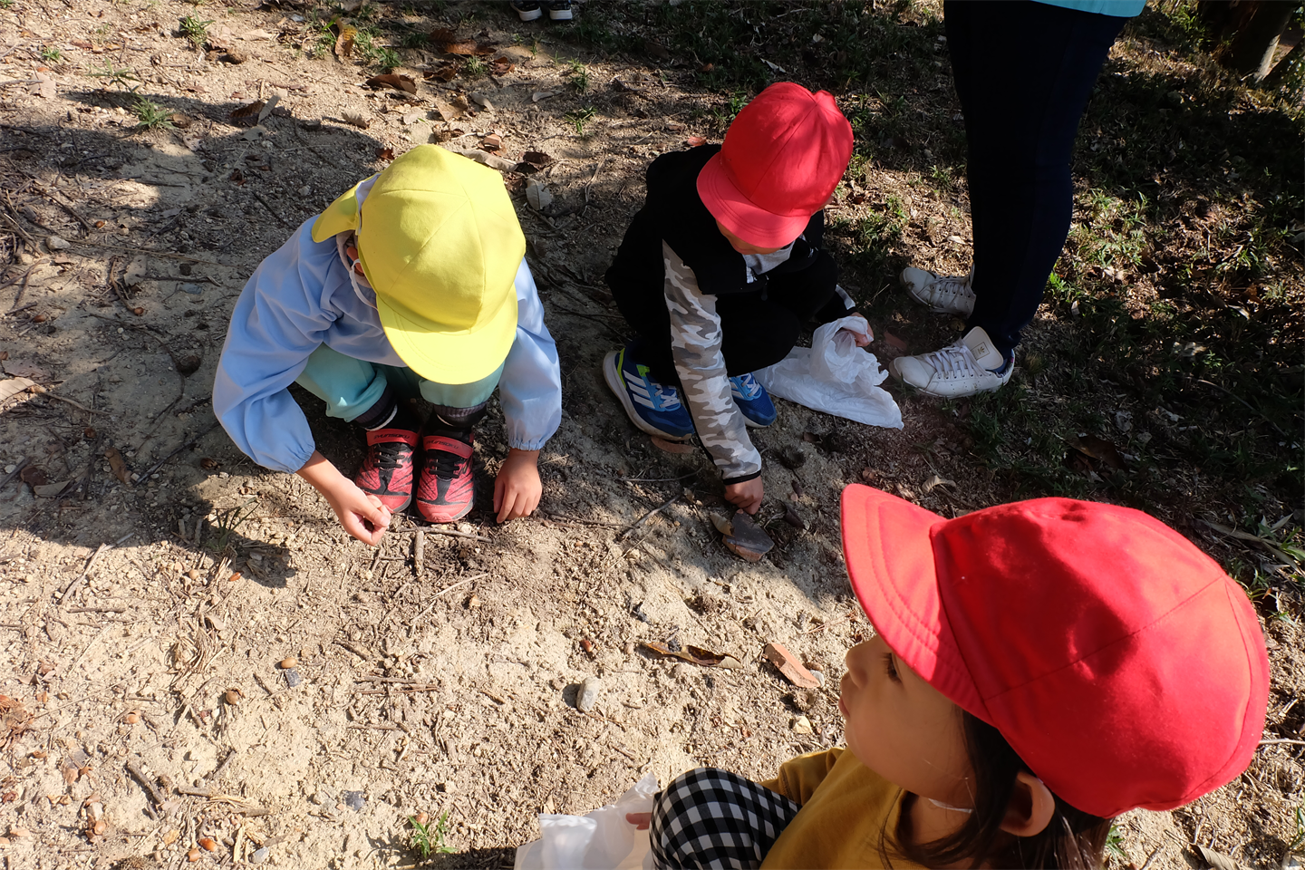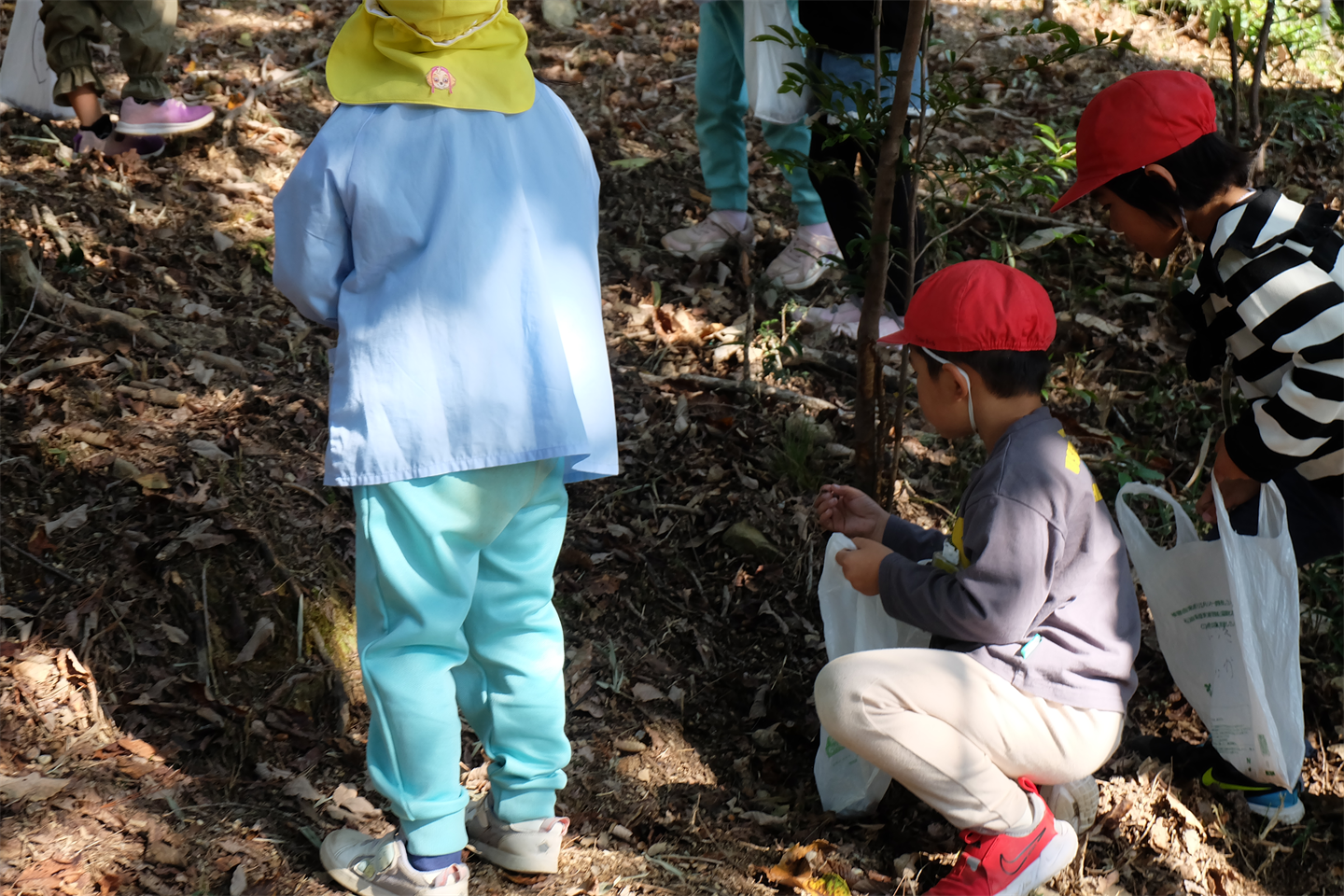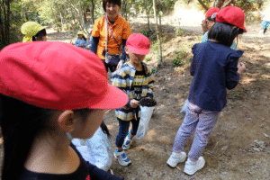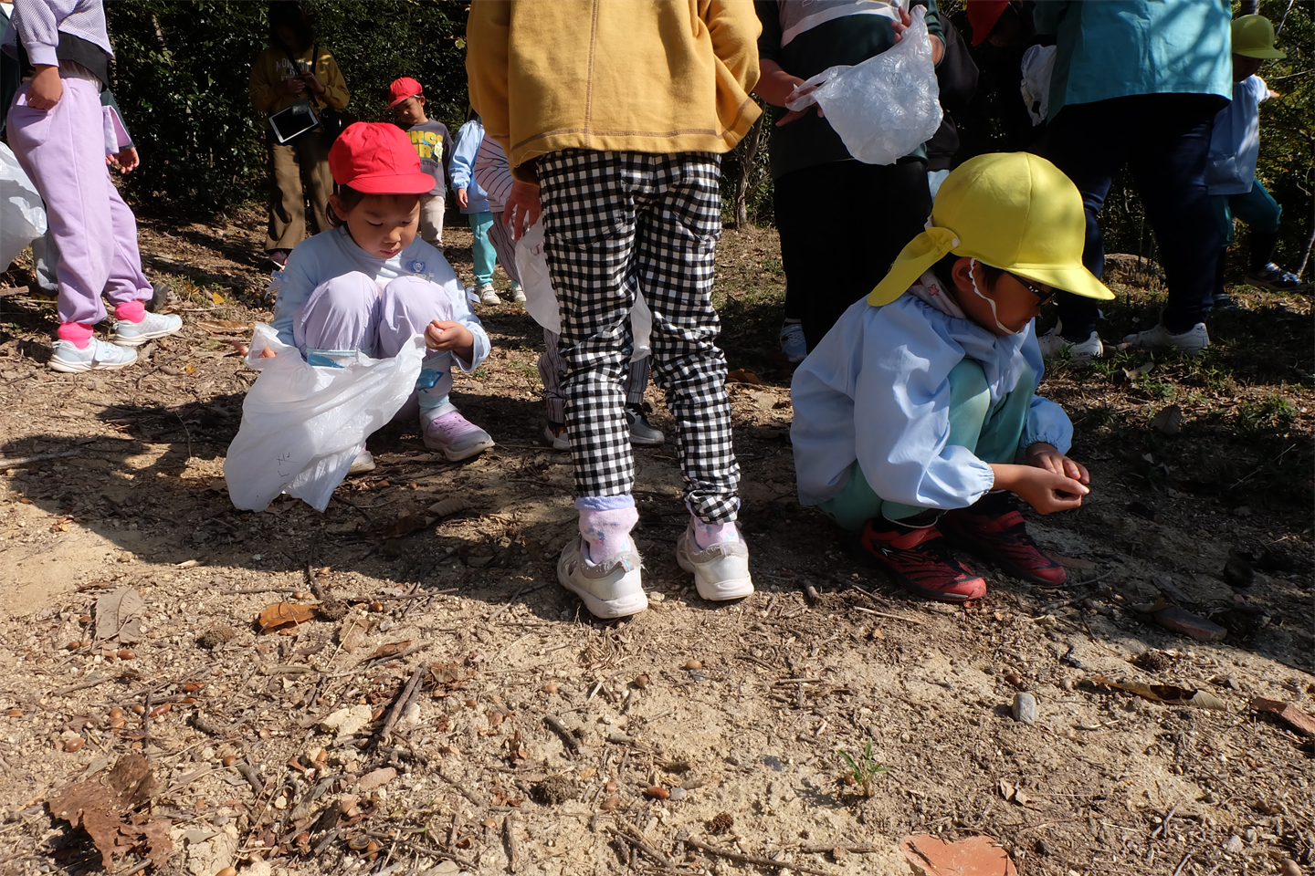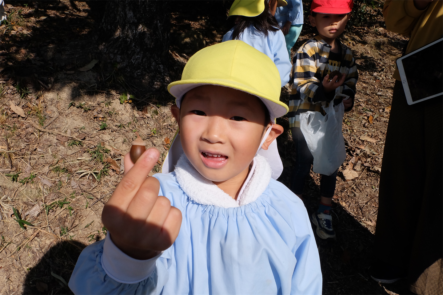 初めにどんぐりがたくさん落ちている所を紹介し、どんぐり拾いスタート手 (チョキ)