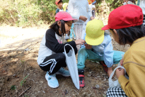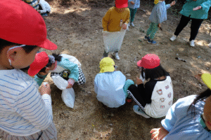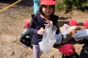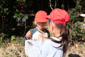 年長組さんから先日ぴかぴか山で見つけた“やまなし”をプレゼント揺れるハート