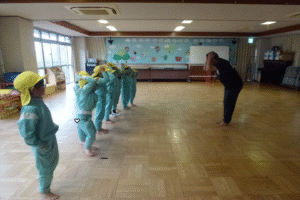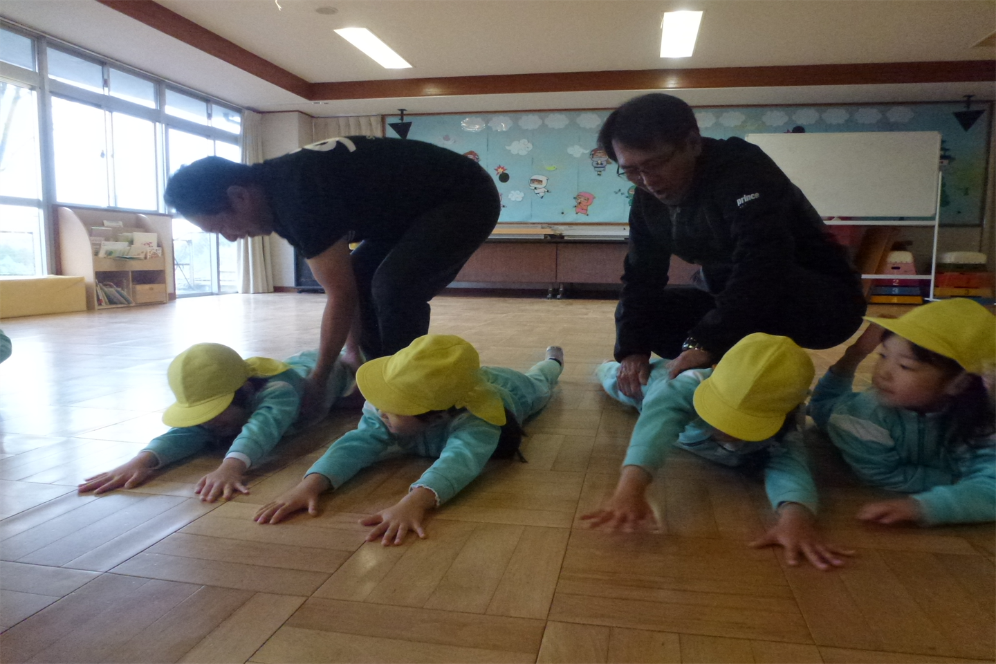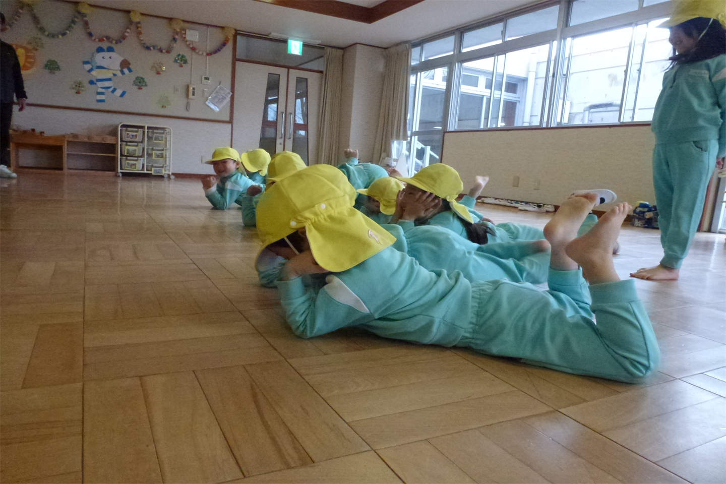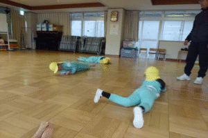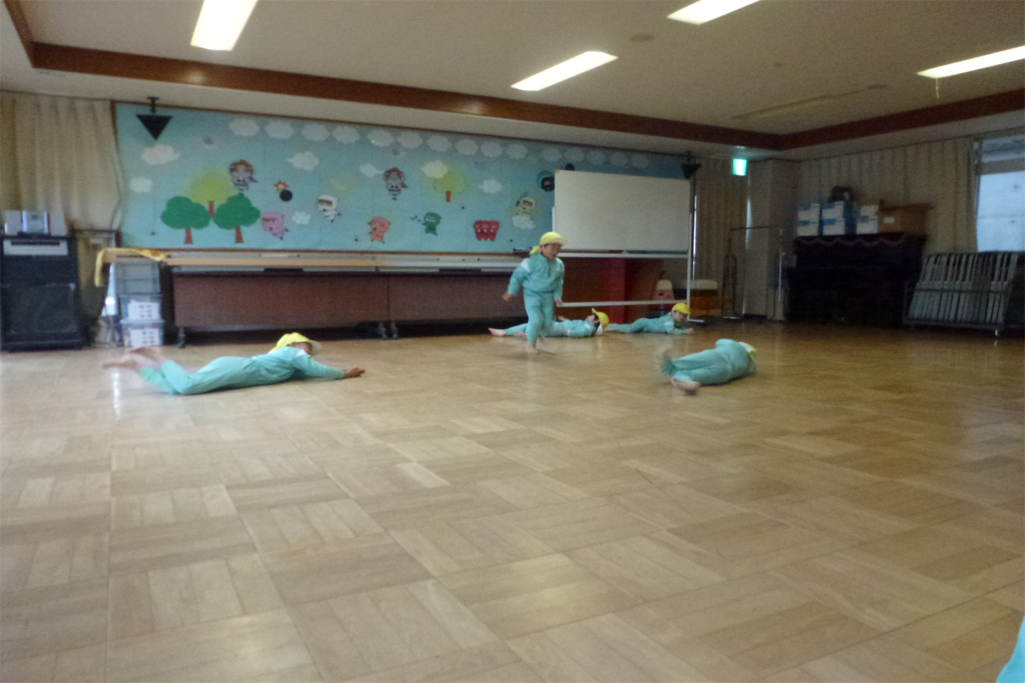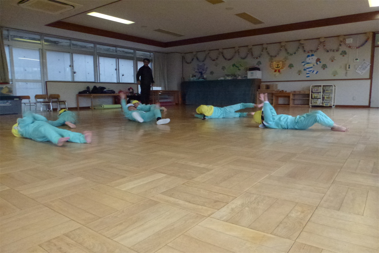 まず始めは笛の合図で、座る・立つ・寝ころぶ運動をしました。