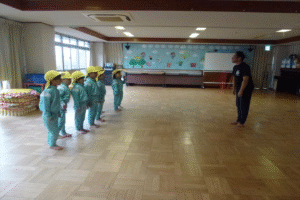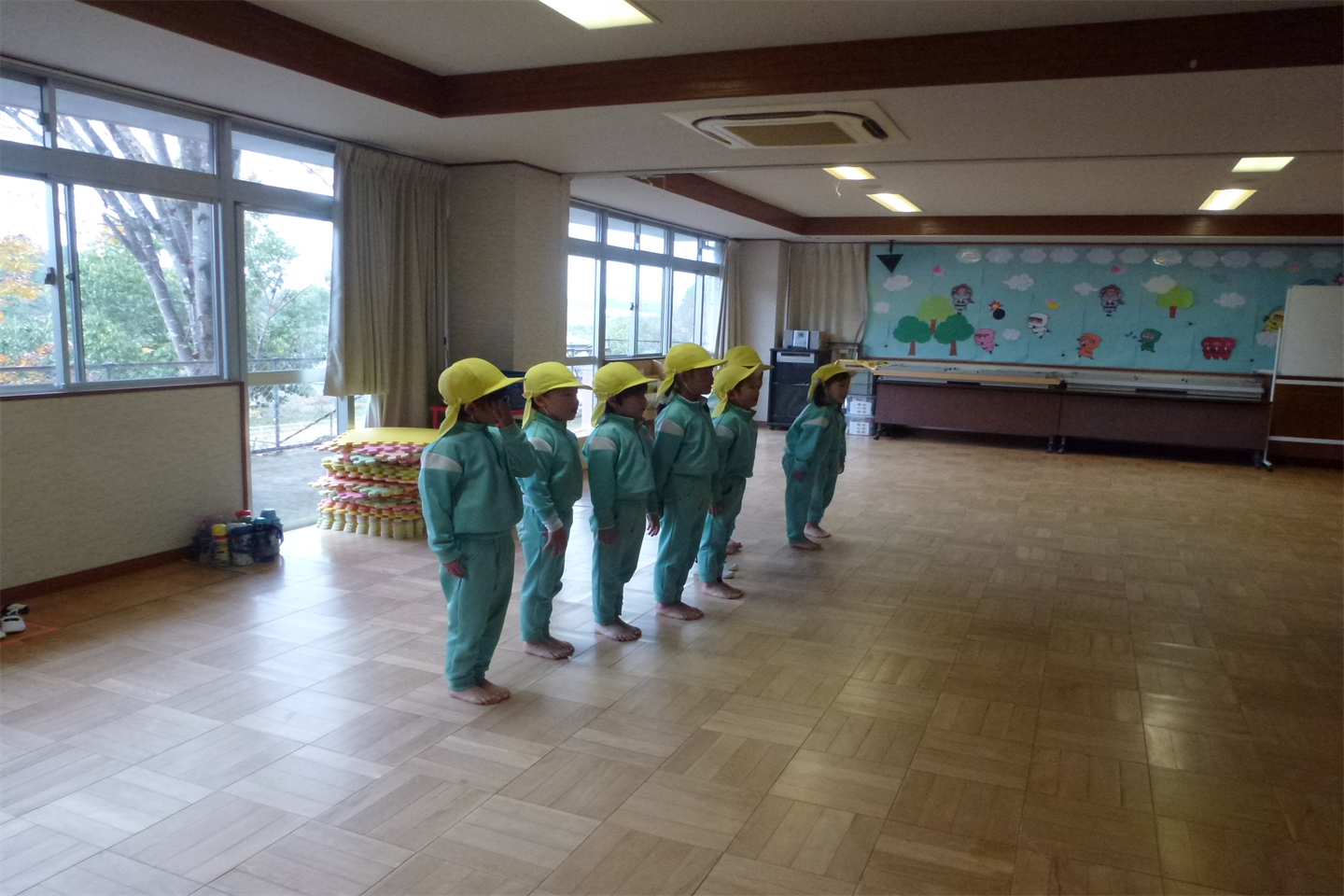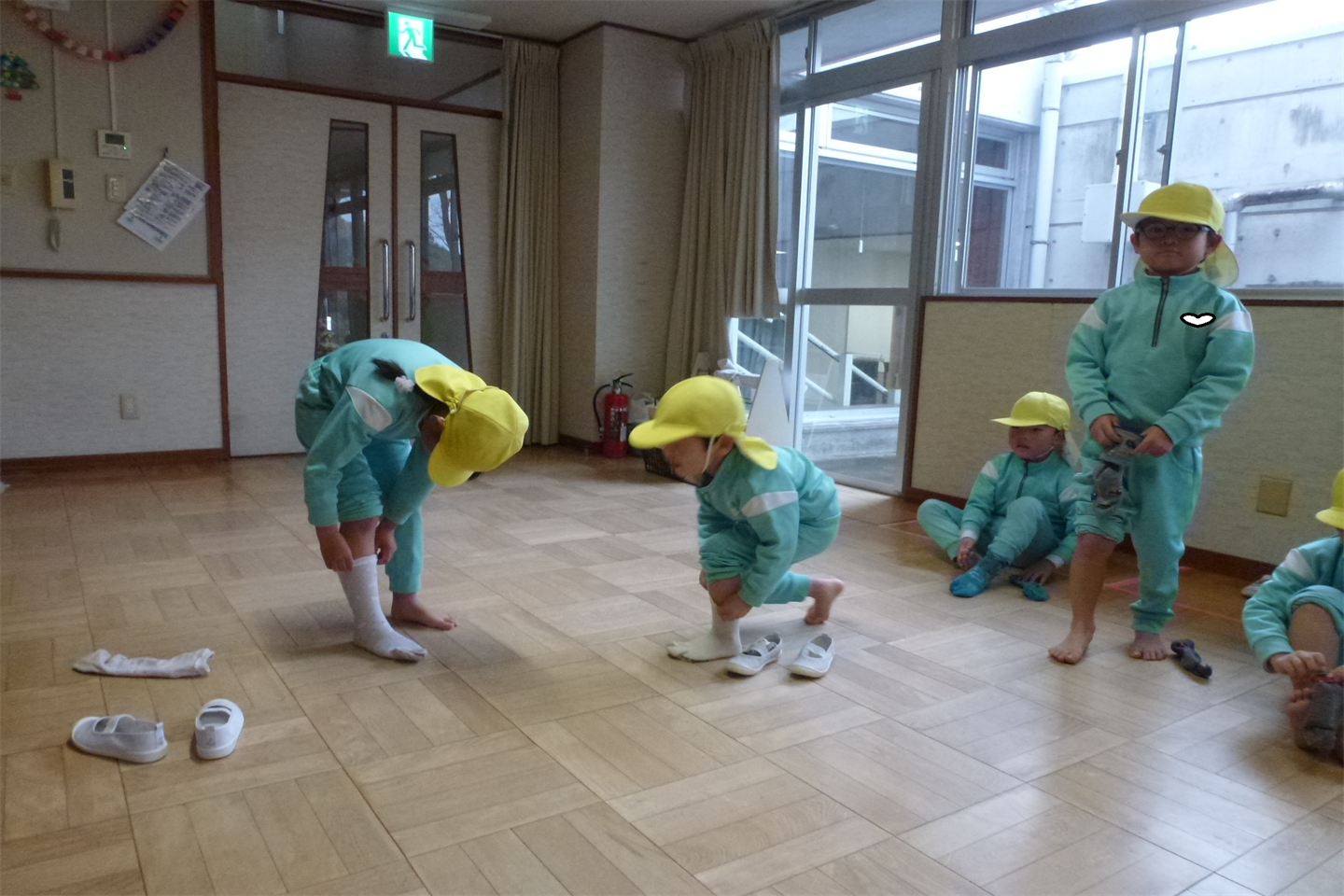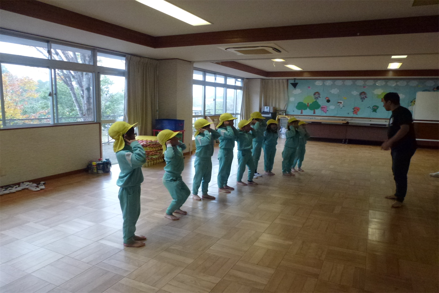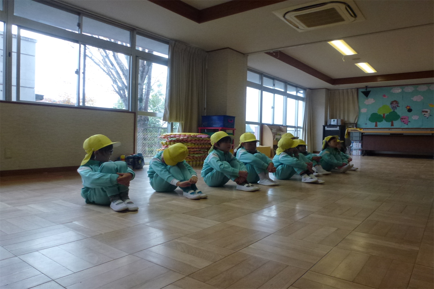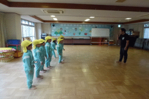 まず始めは笛の合図で、座る・立つ・寝ころぶ運動をしました。