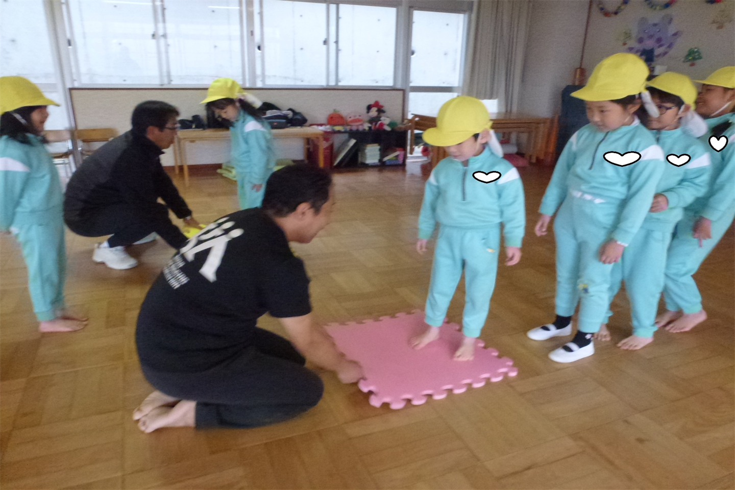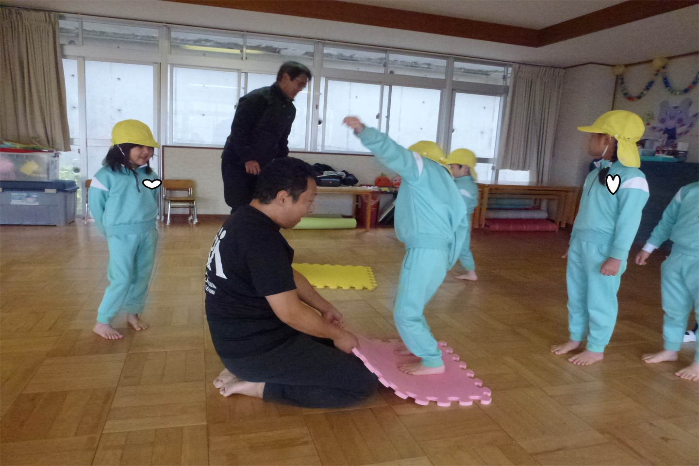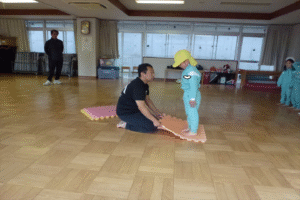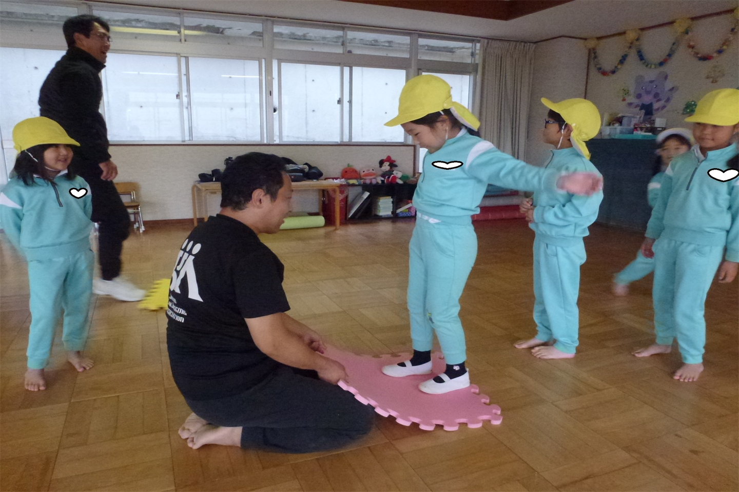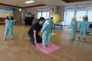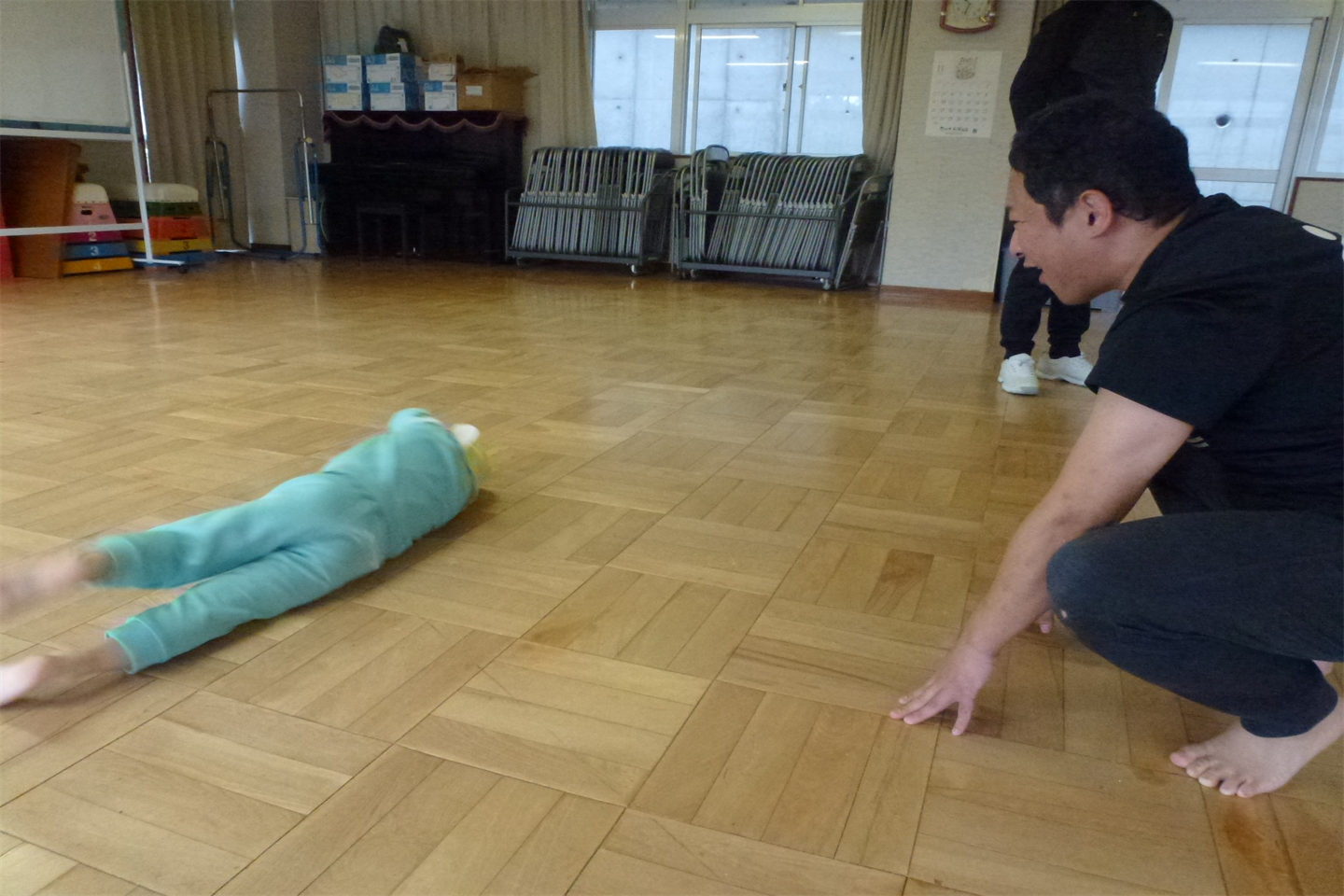 子どもは立ち先生がマットを少し動かし、子どもはマットの上で