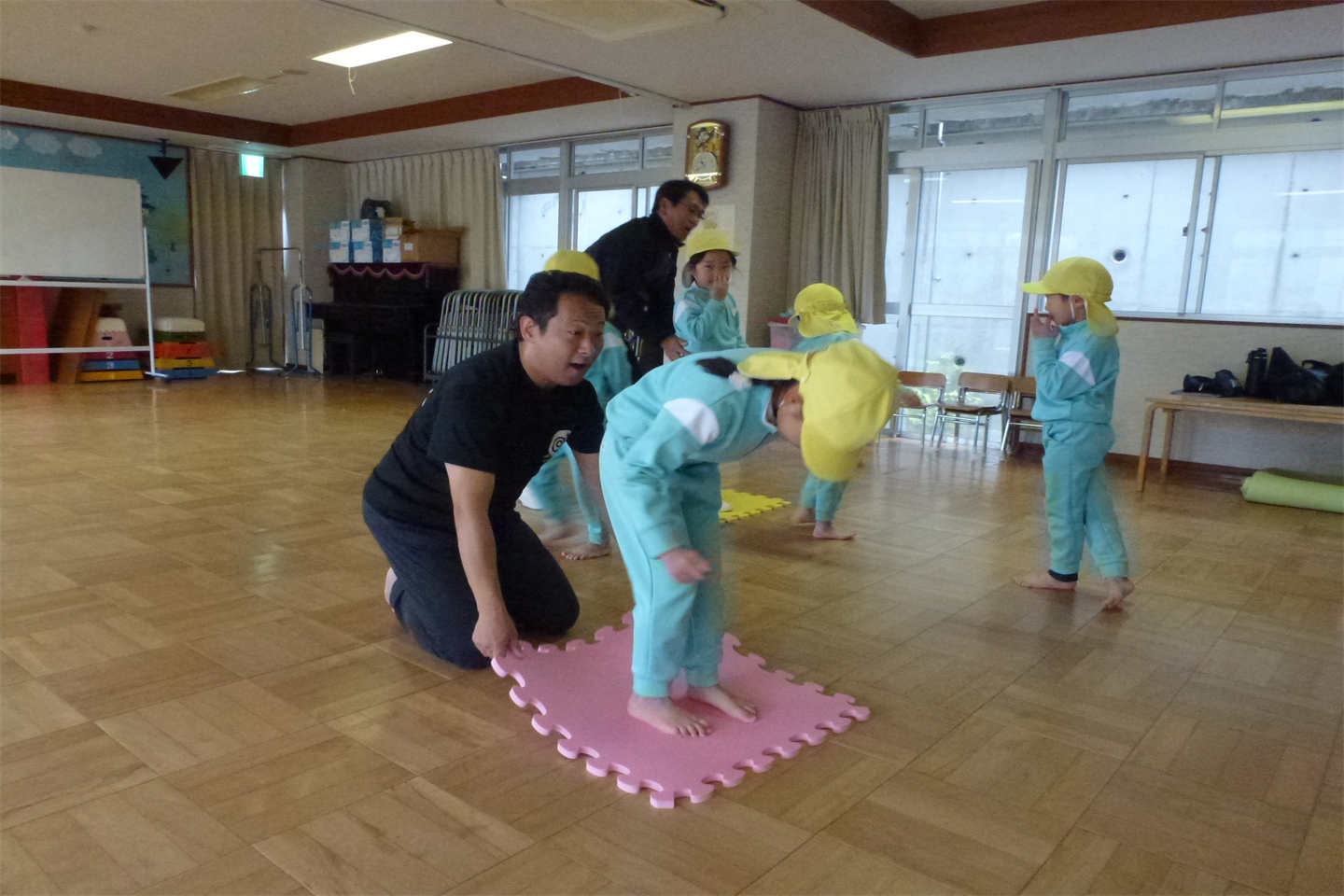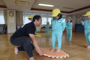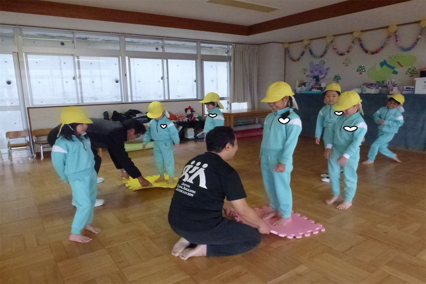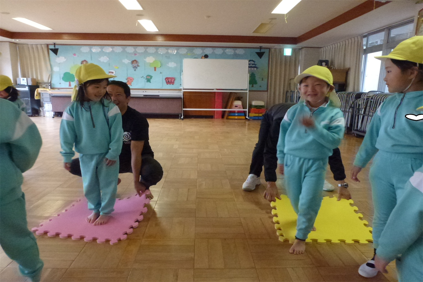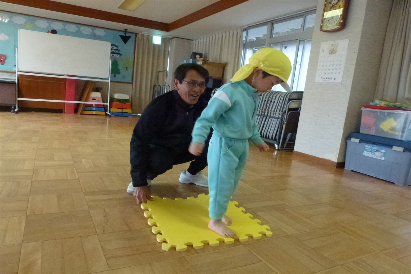 子どもは立ち先生がマットを少し動かし、子どもはマットの上で