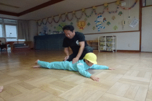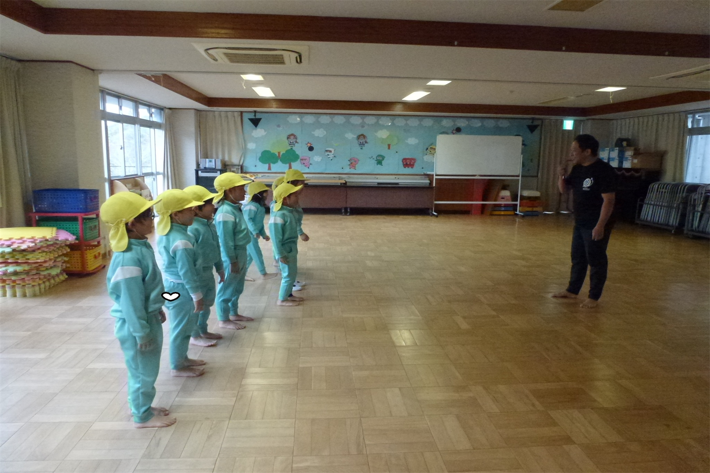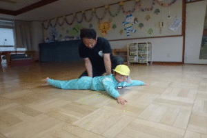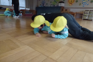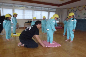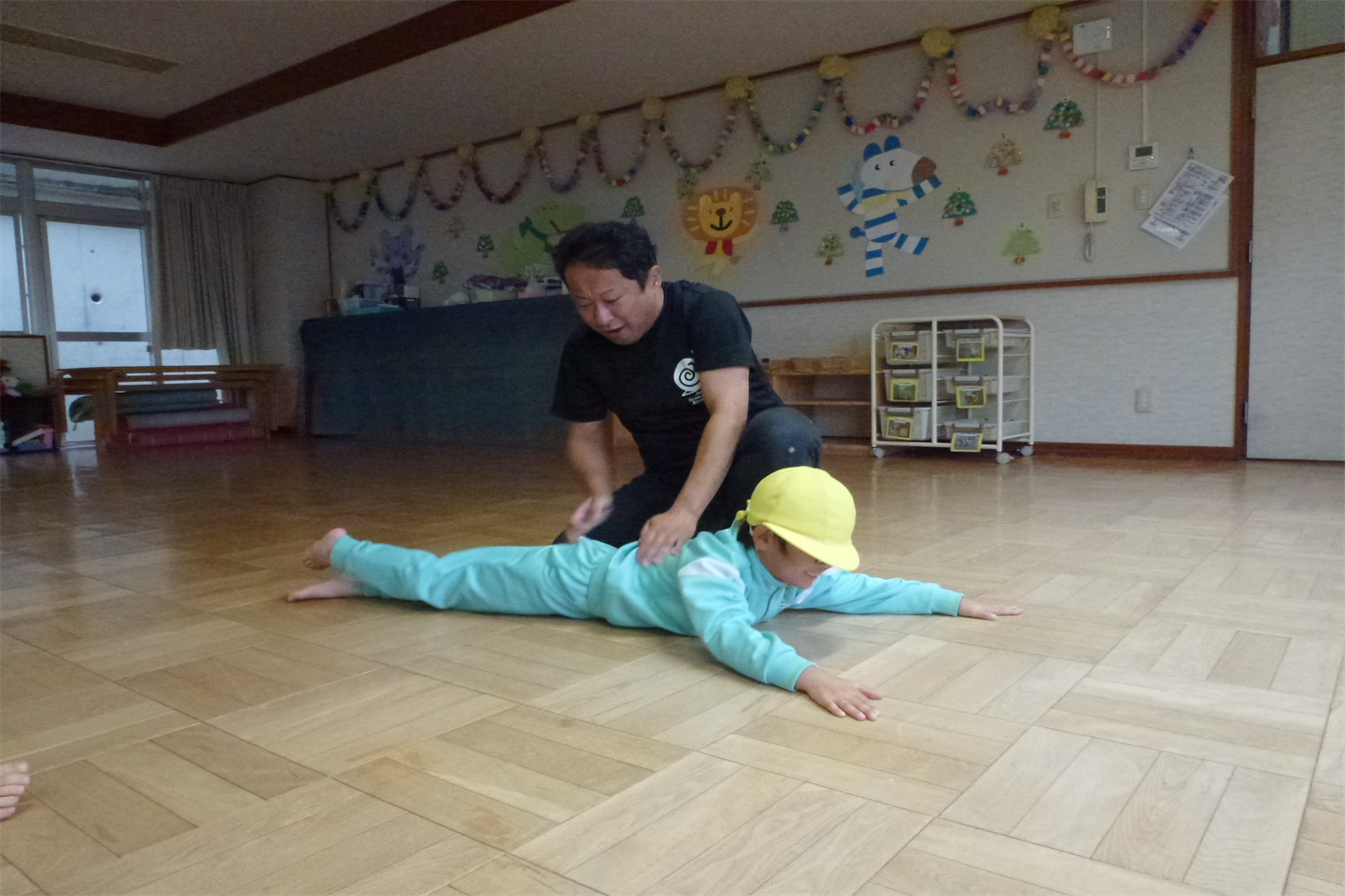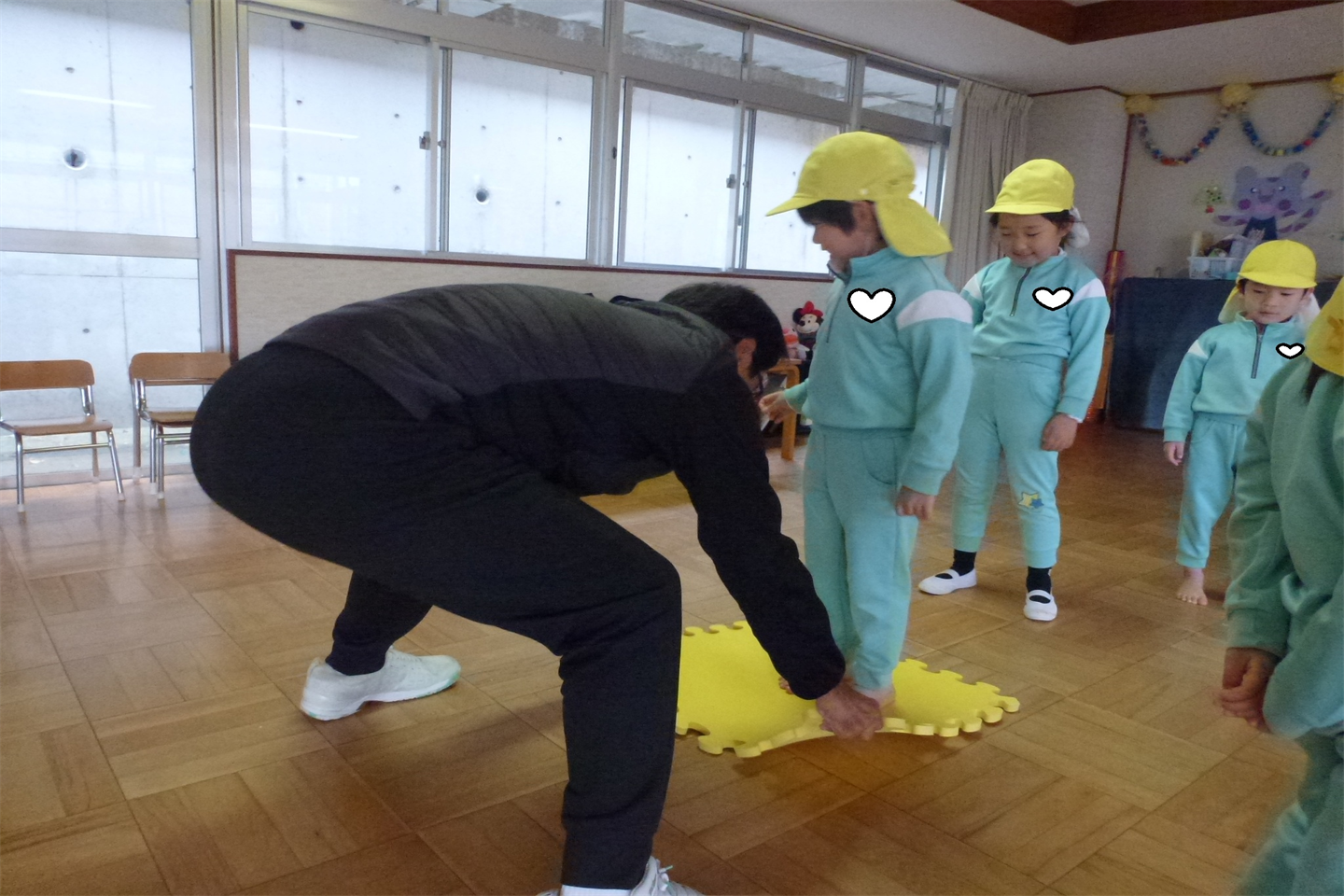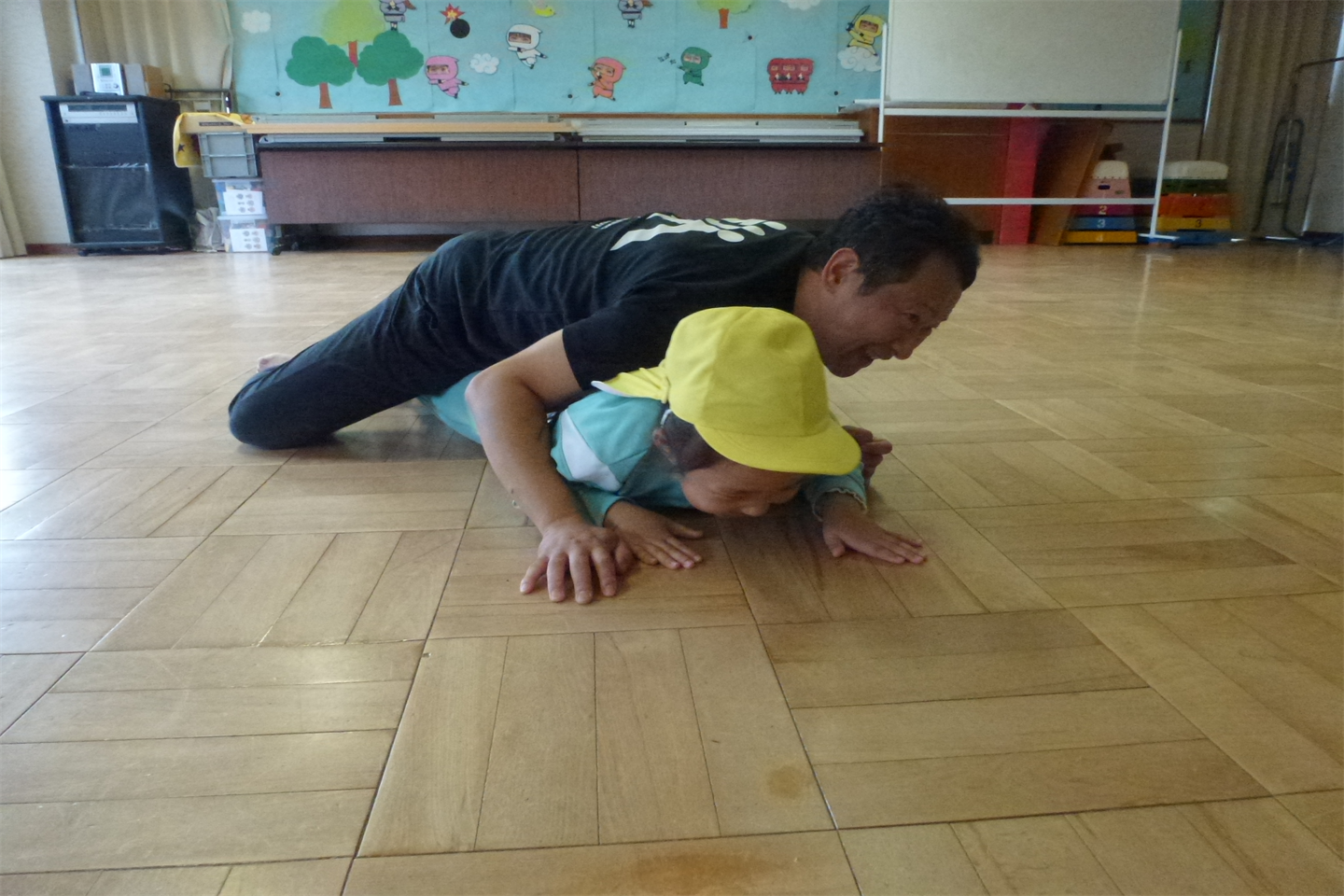 子どもは立ち先生がマットを少し動かし、子どもはマットの上で