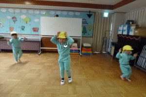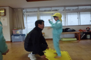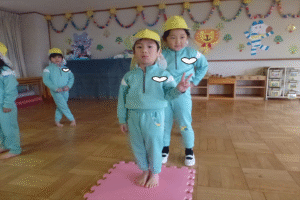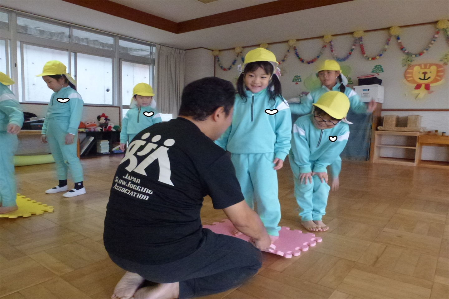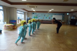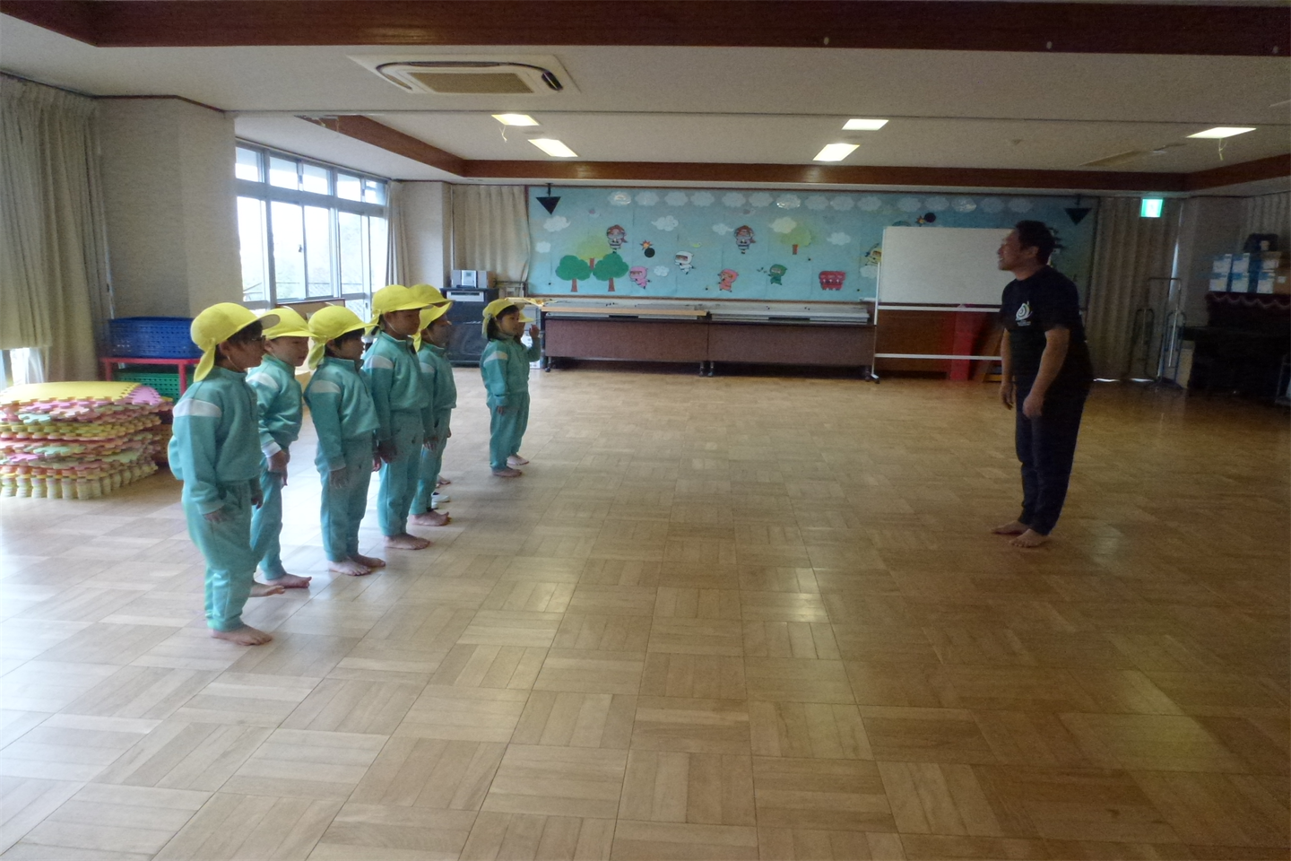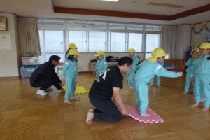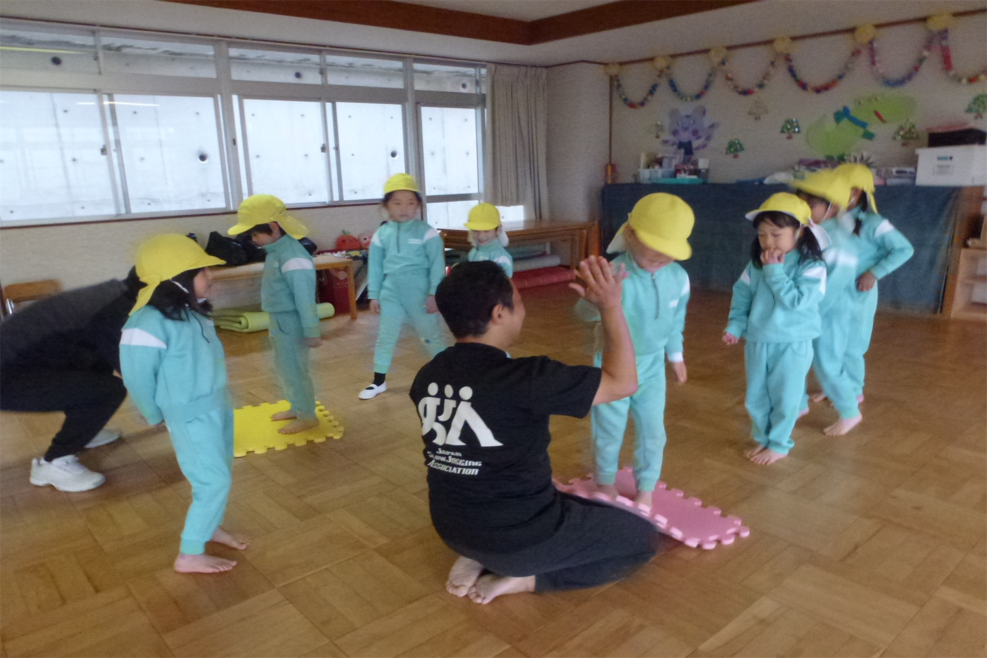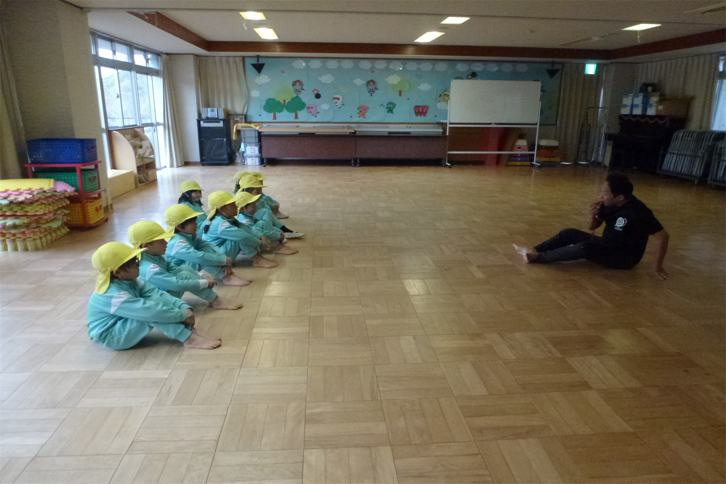 子どもは立ち先生がマットを少し動かし、子どもはマットの上で