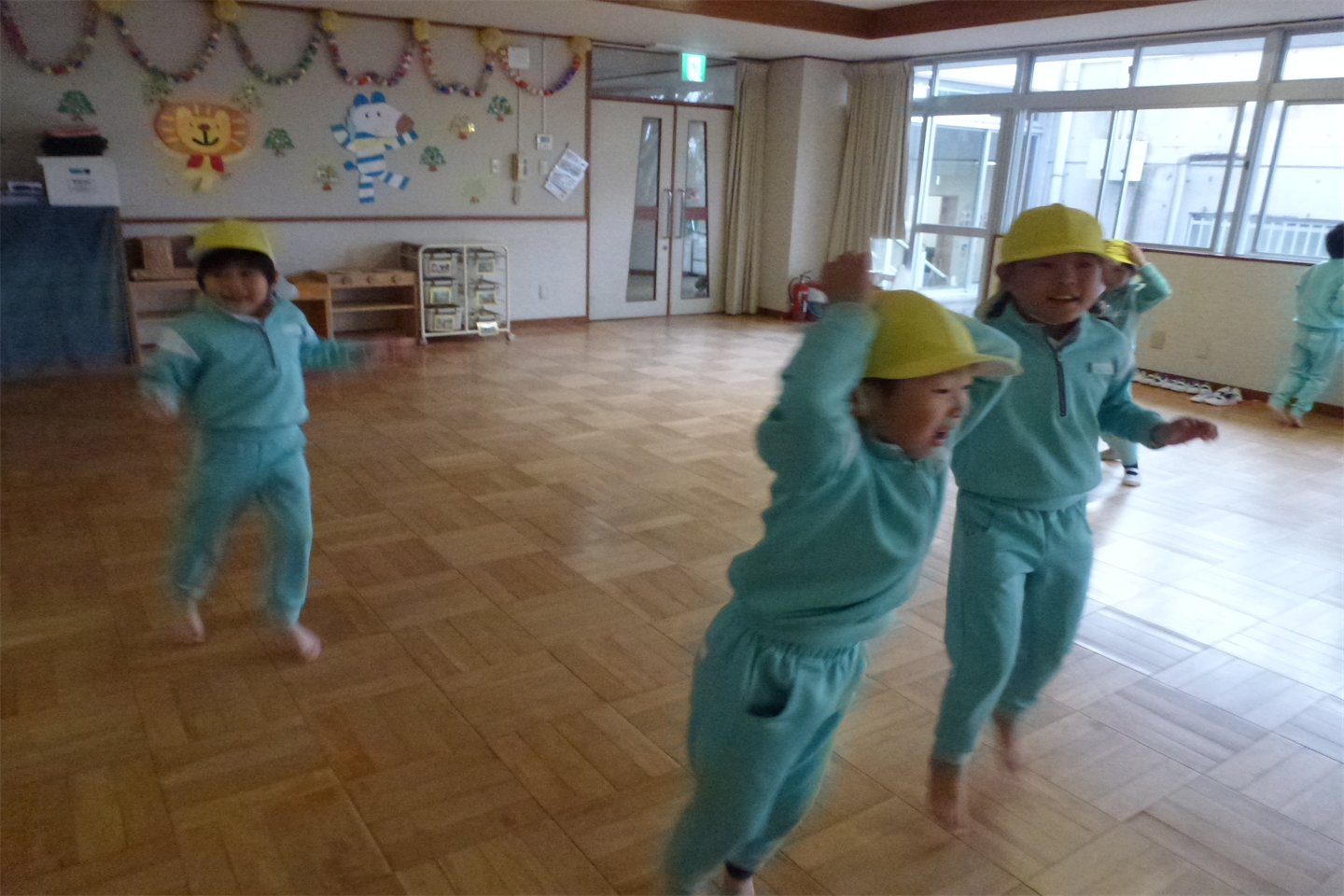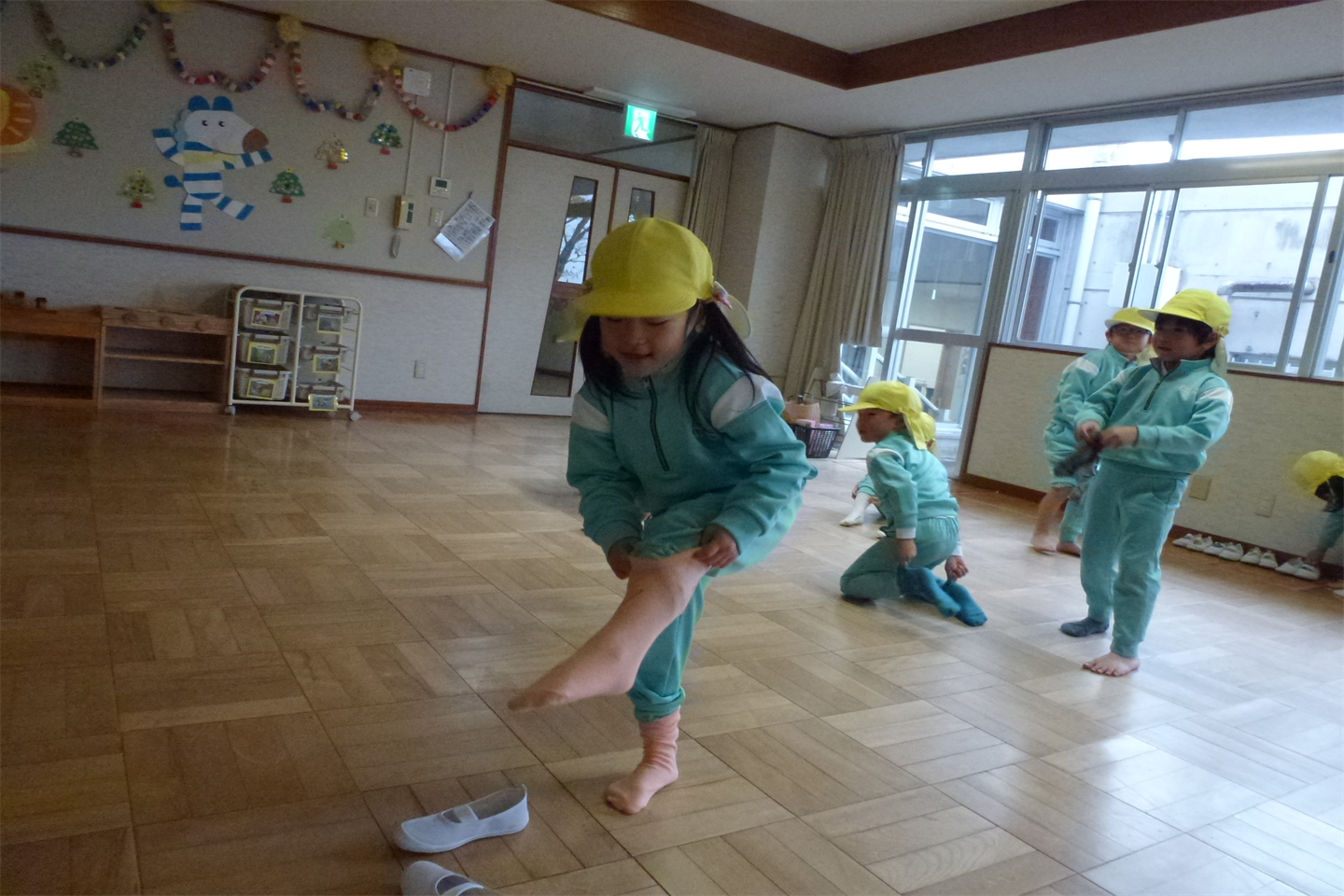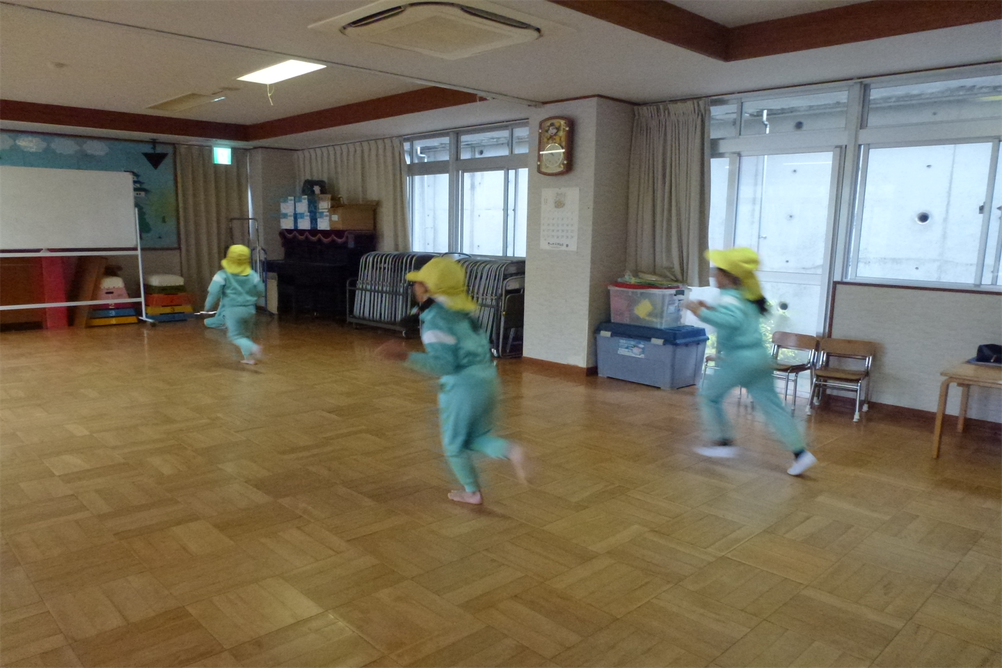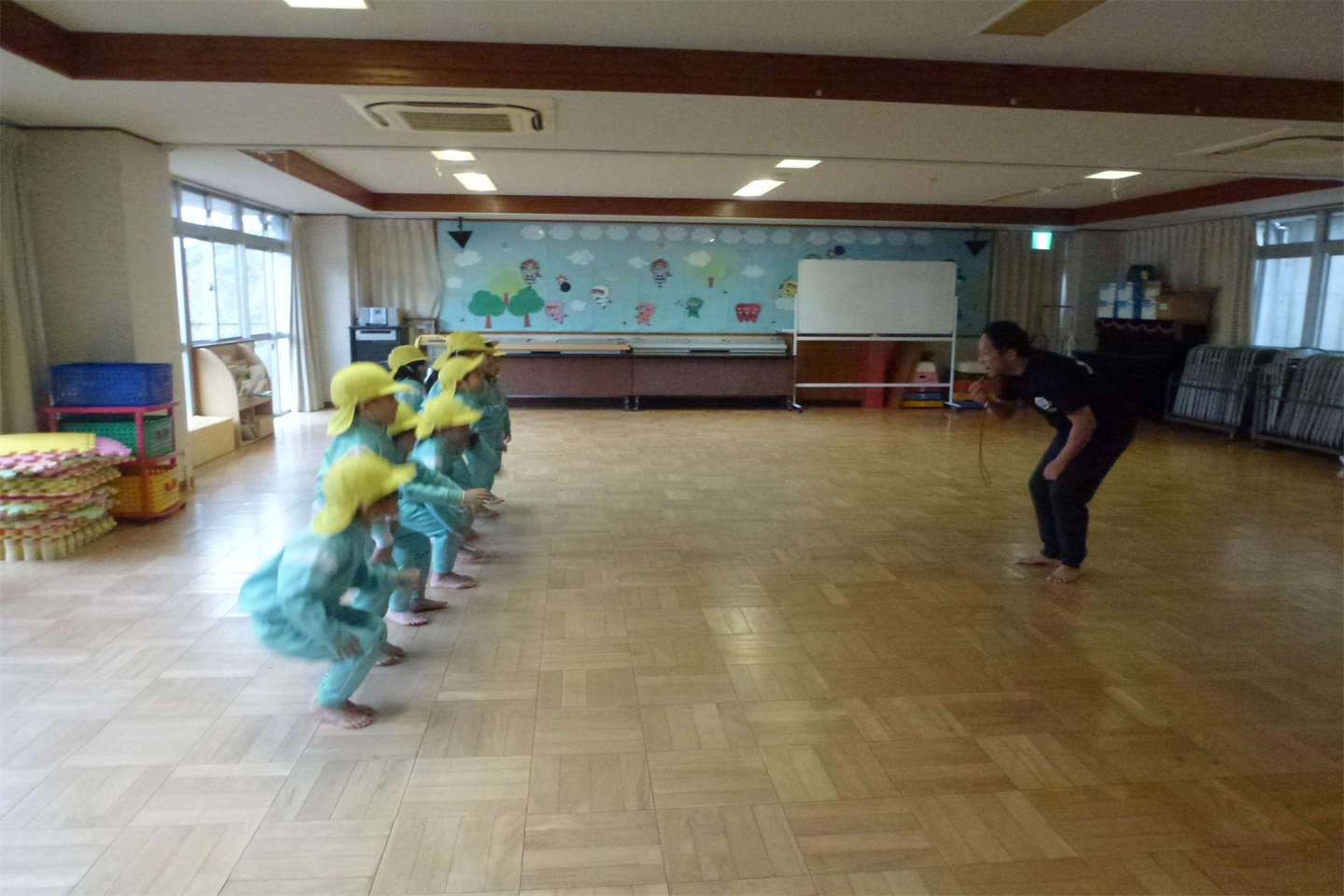 次にうさぎ跳びをしながら、先生に捕まらないように逃げるゲームを行いました!