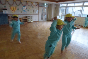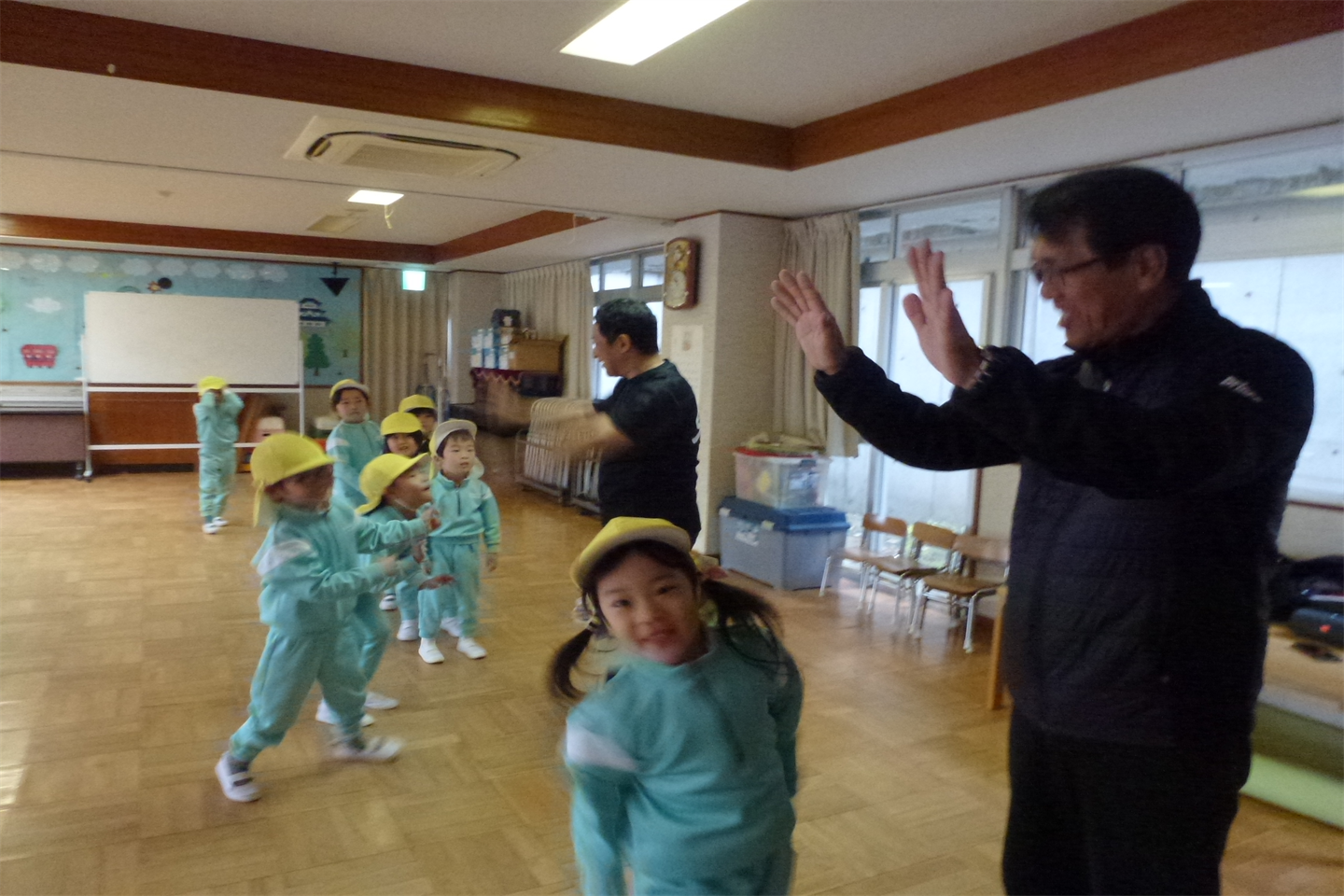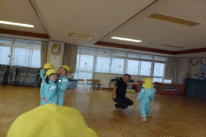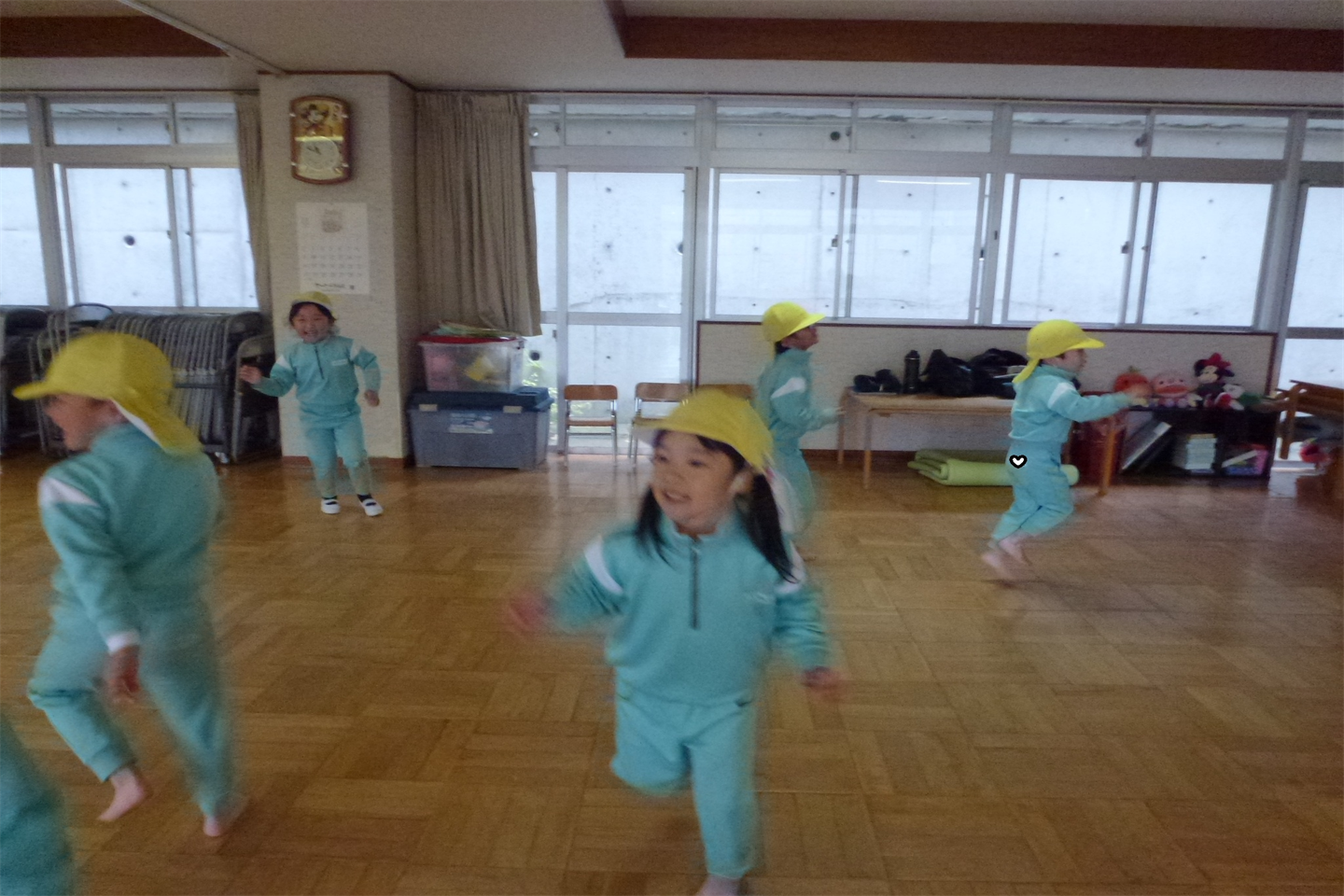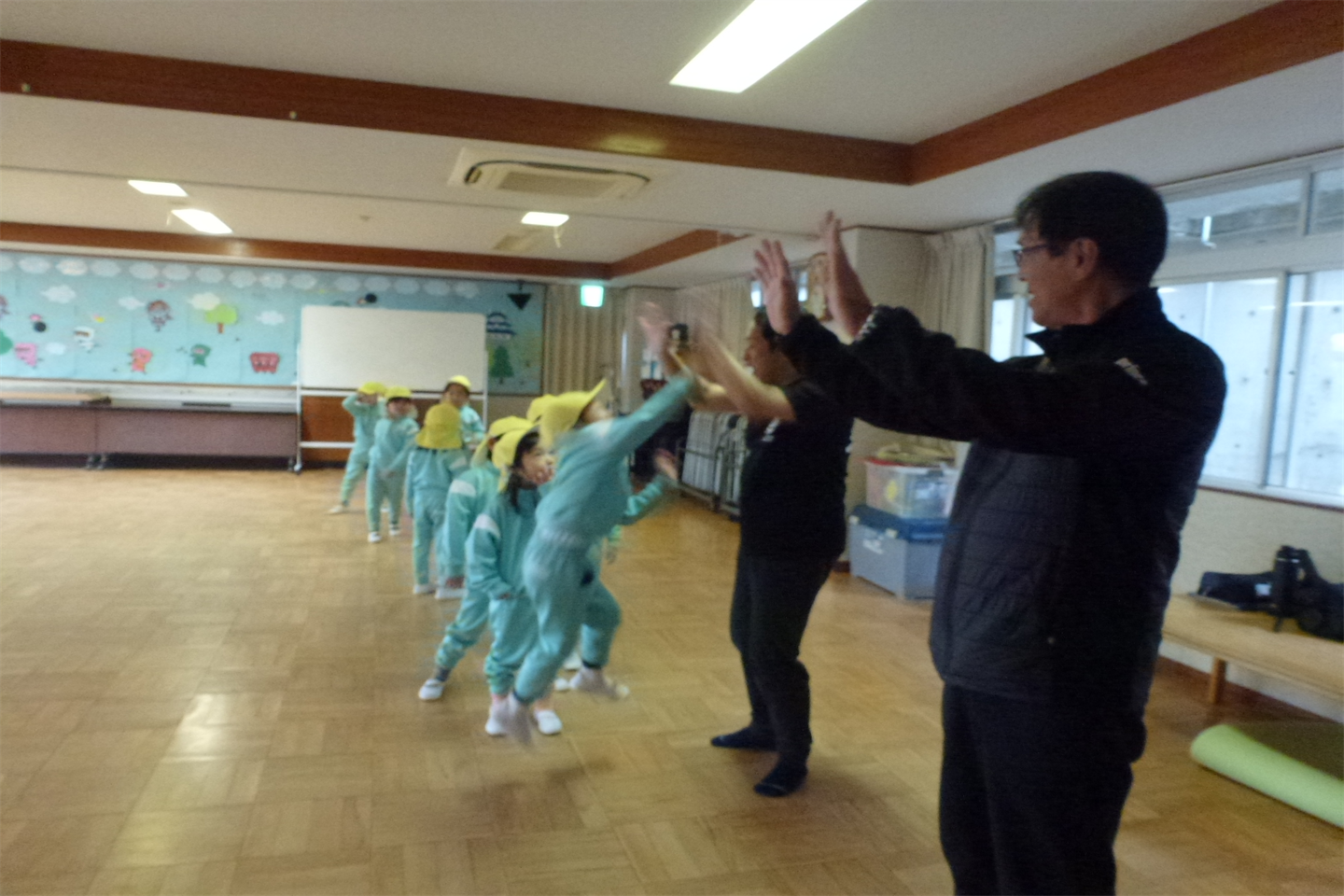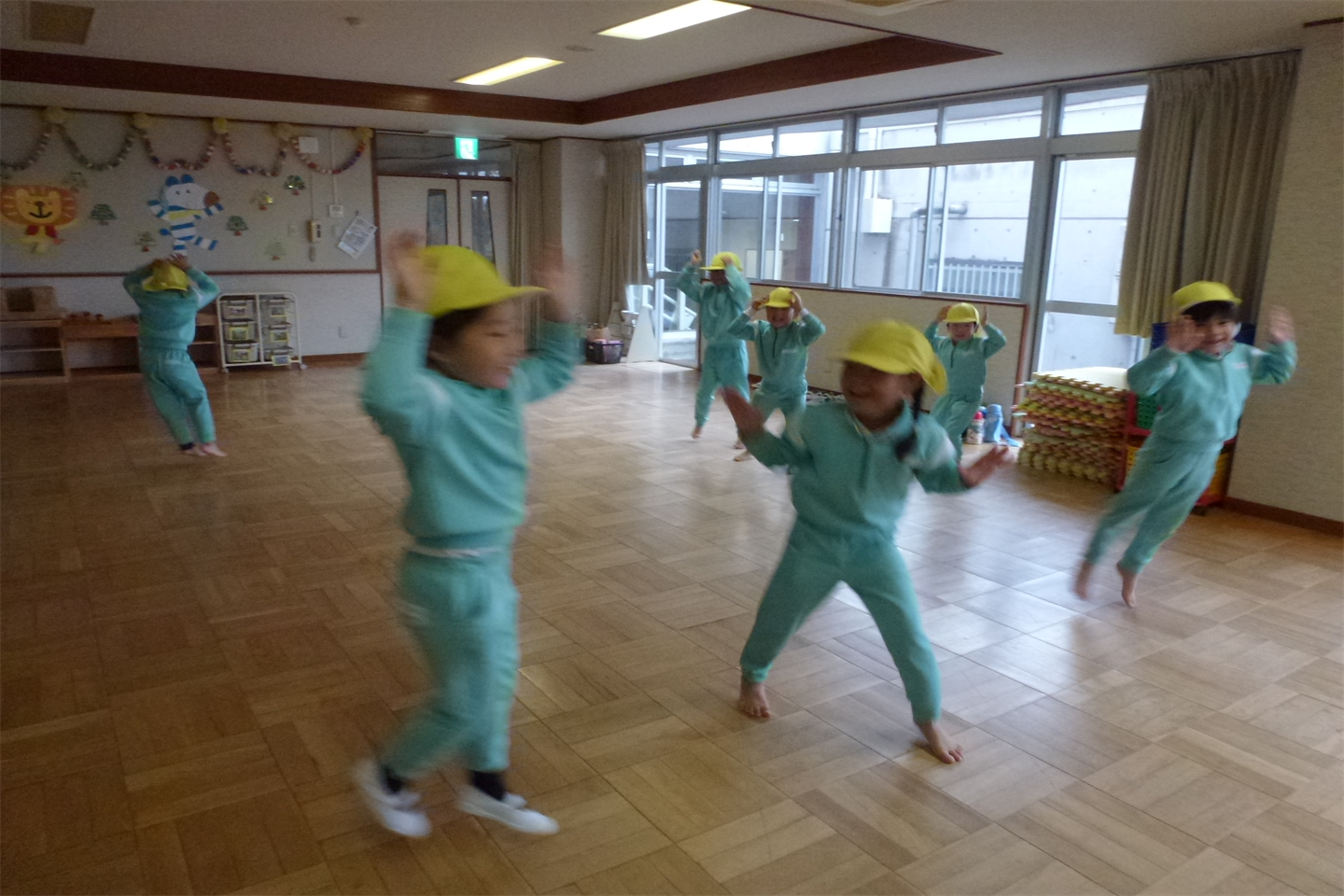 次にうさぎ跳びをしながら、先生に捕まらないように逃げるゲームを行いました!