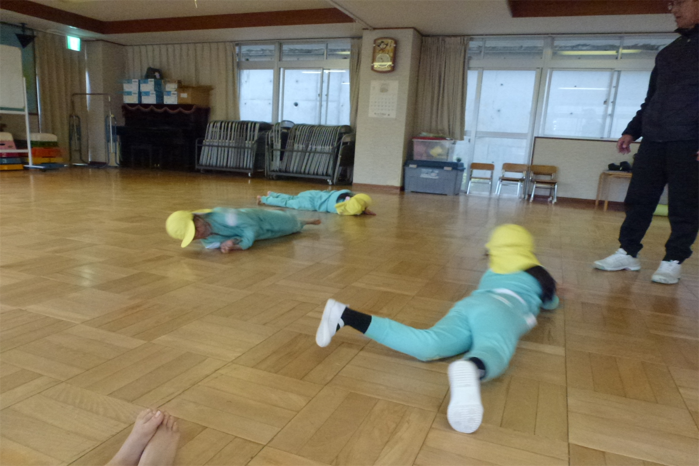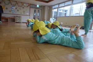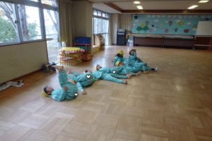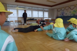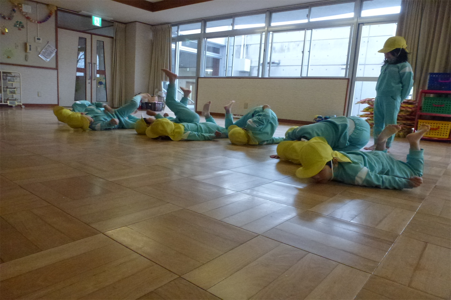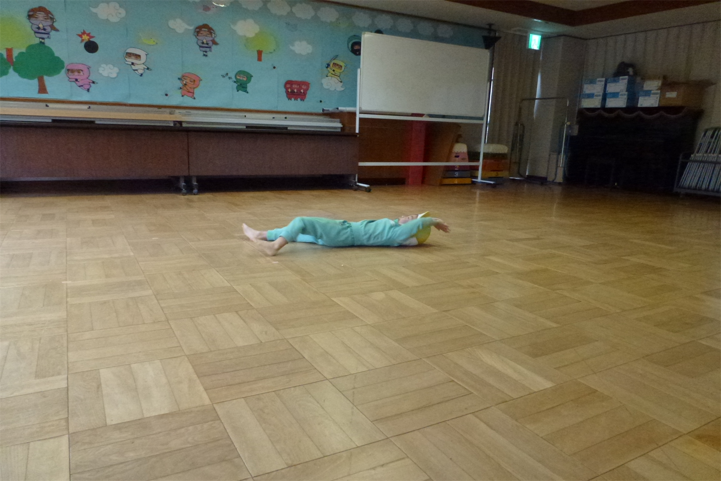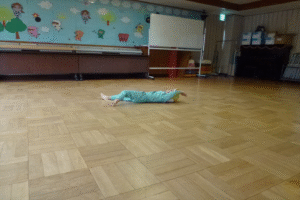 次は、子ども達は床に寝転がり先生にツンと触られた子は