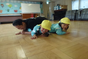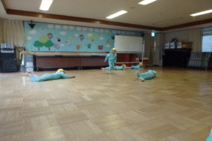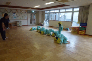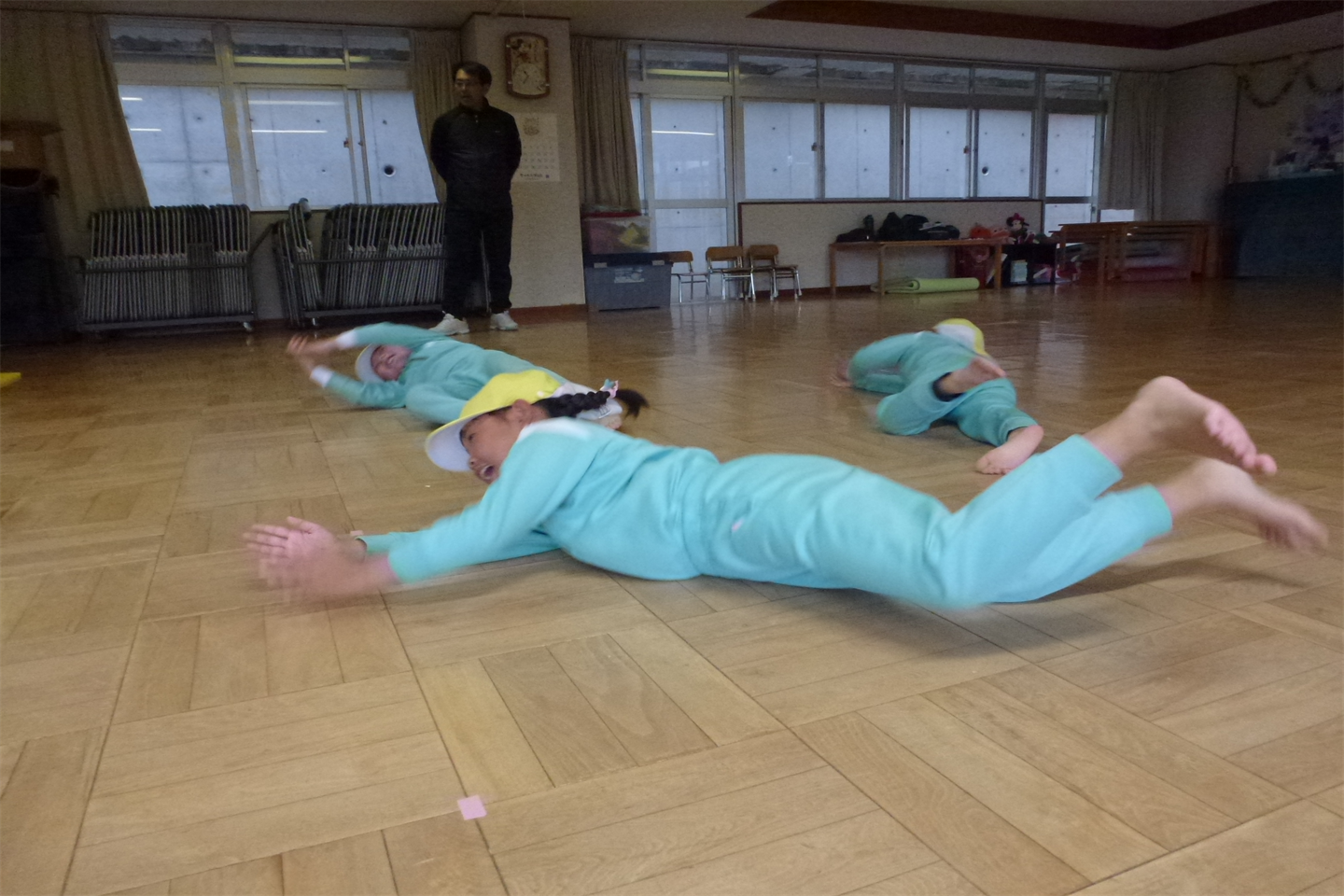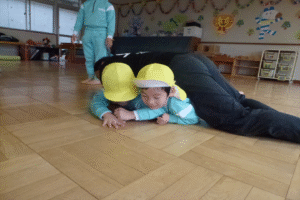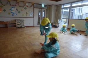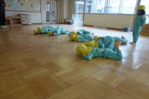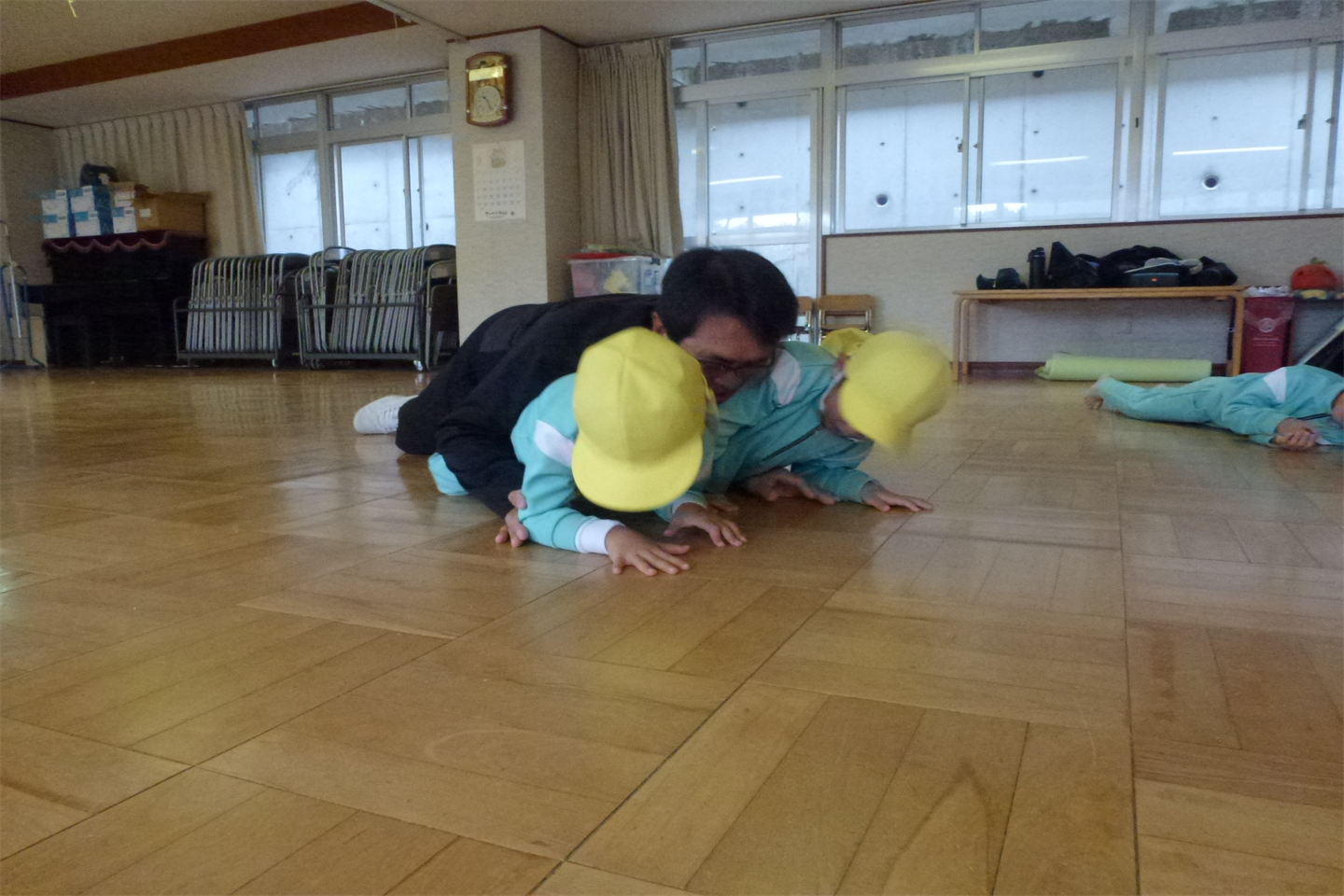 次は、子ども達は床に寝転がり先生にツンと触られた子は