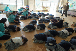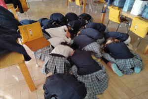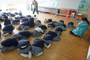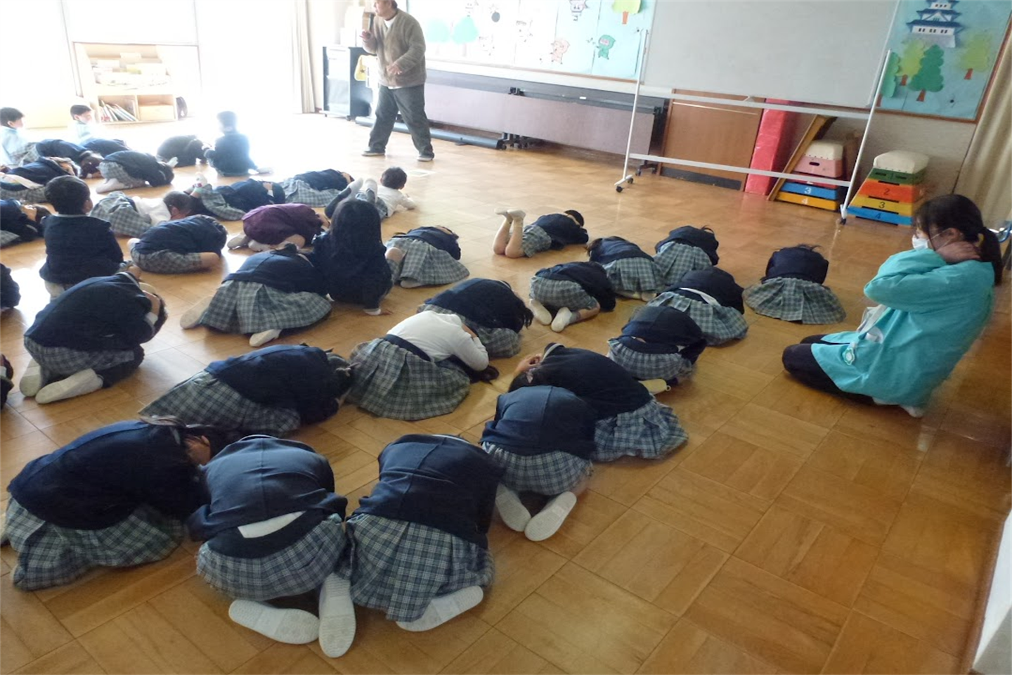 熊が出たと放送を聞いた後、各クラスでは…うつ伏せになり、首の後ろを両手で覆い身を守る姿勢をとる子どもたち。いつもと違う様子で少し緊張をした姿が見られました!