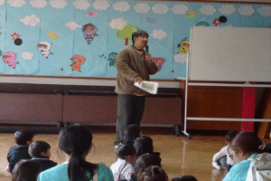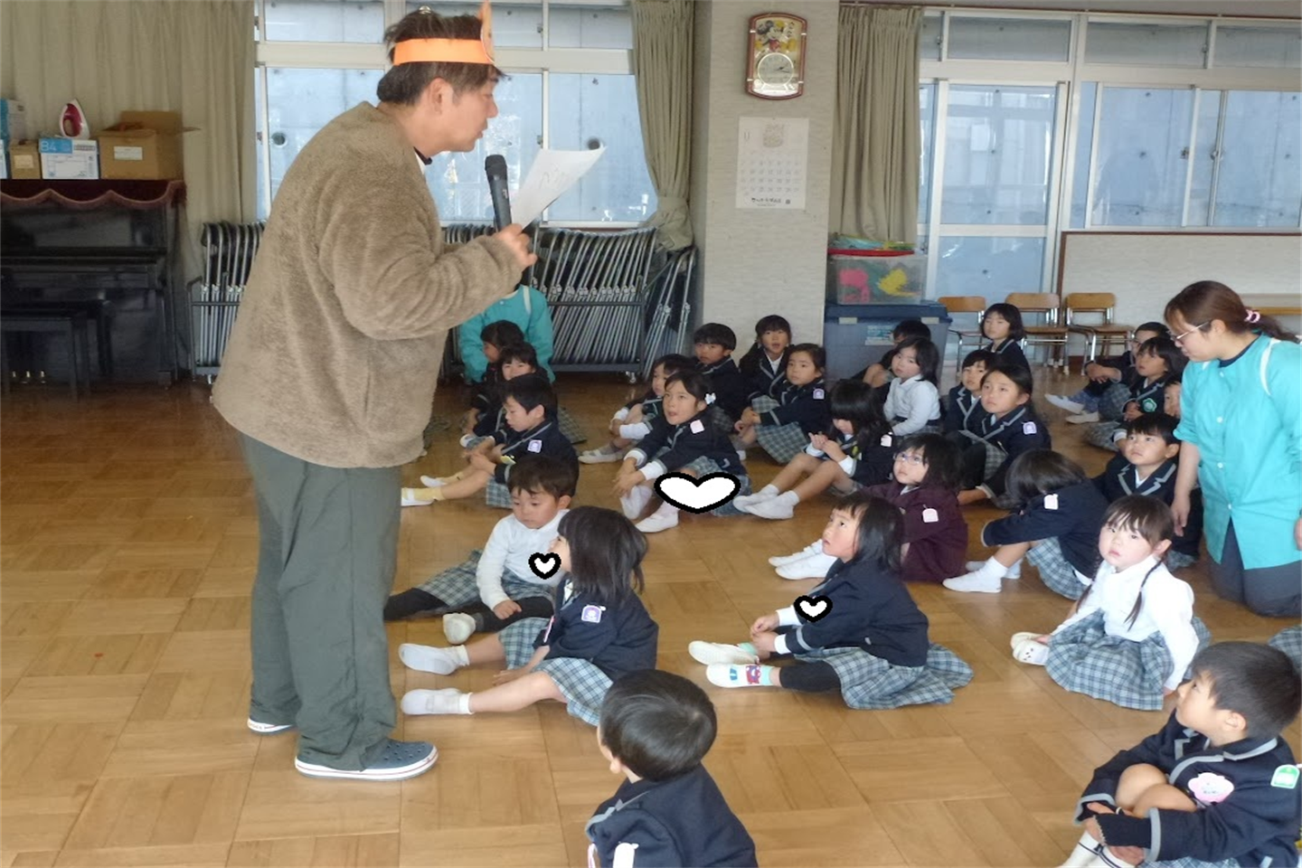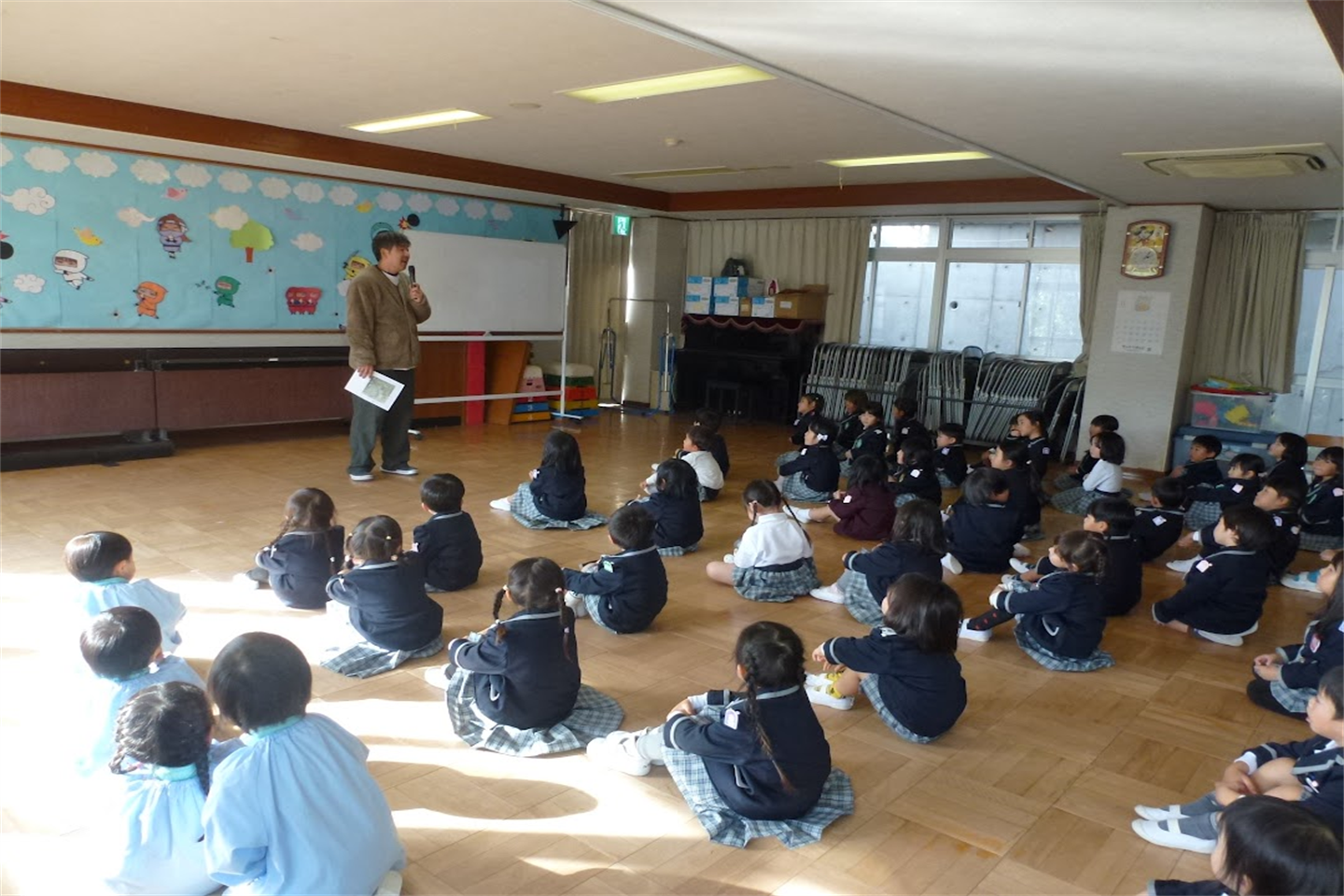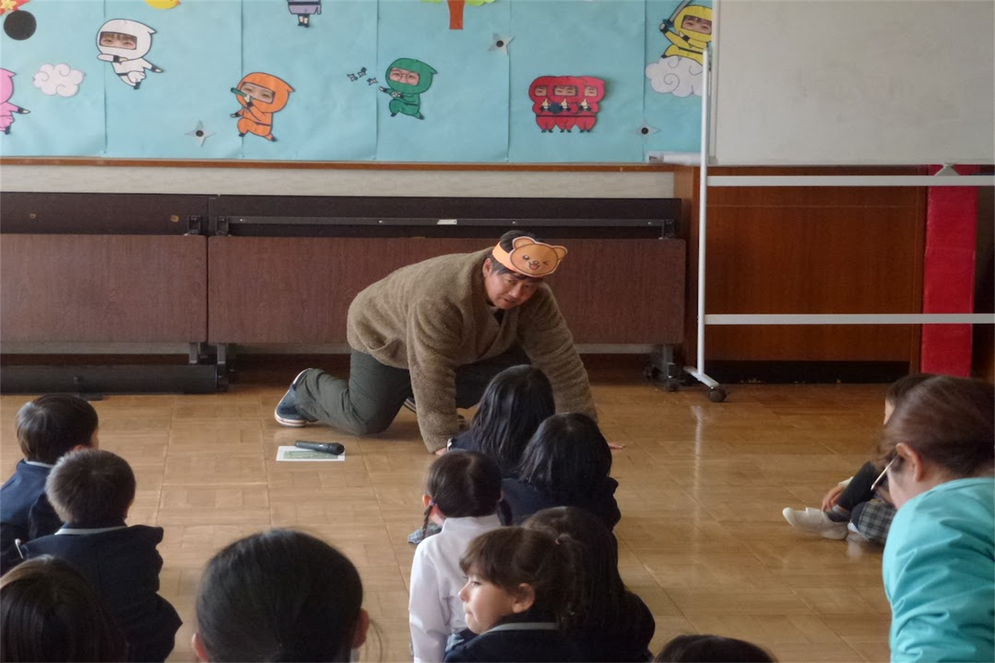 落ち着いて、お遊戯室まで移動をした後は、園長先生から「熊に出会った時、どんな行動が命を守るのか」について、お話しを聞きました。