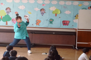 園長先生が熊役。あい先生が熊に出会った時にどういう行動をとるのか、見本を見て学んでいきました🐻