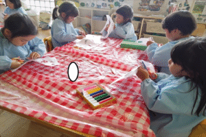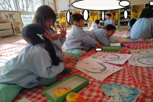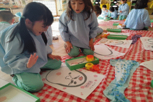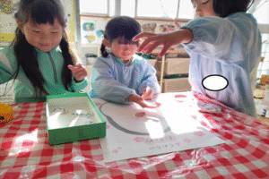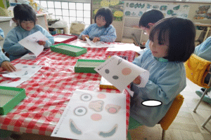 始めは「かわいいお顔がいいな・・変なお顔になるのは嫌!」と伝える子もいましたが、意味をしると「面白い顔楽しみ!目がどこについちゃうのかな~」とワクワクする様子が