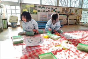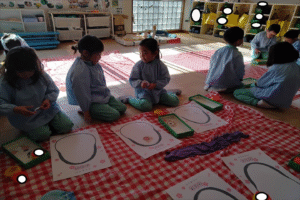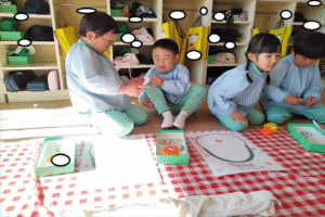 お正月遊び”福笑い”を行いました。「福笑いって何?」と不思議そうな子ども達。