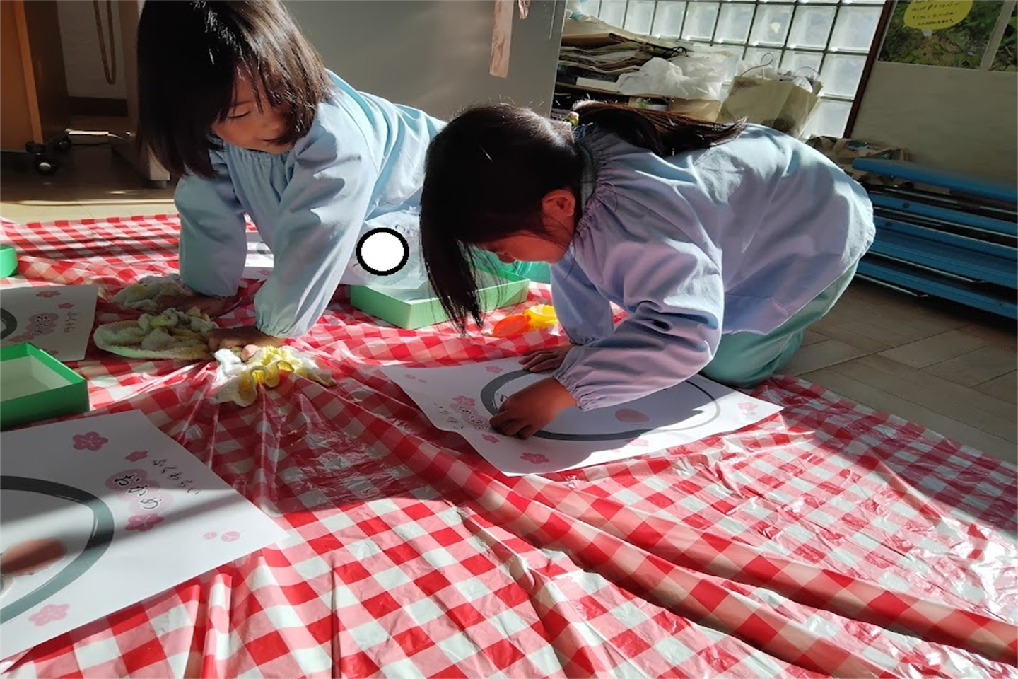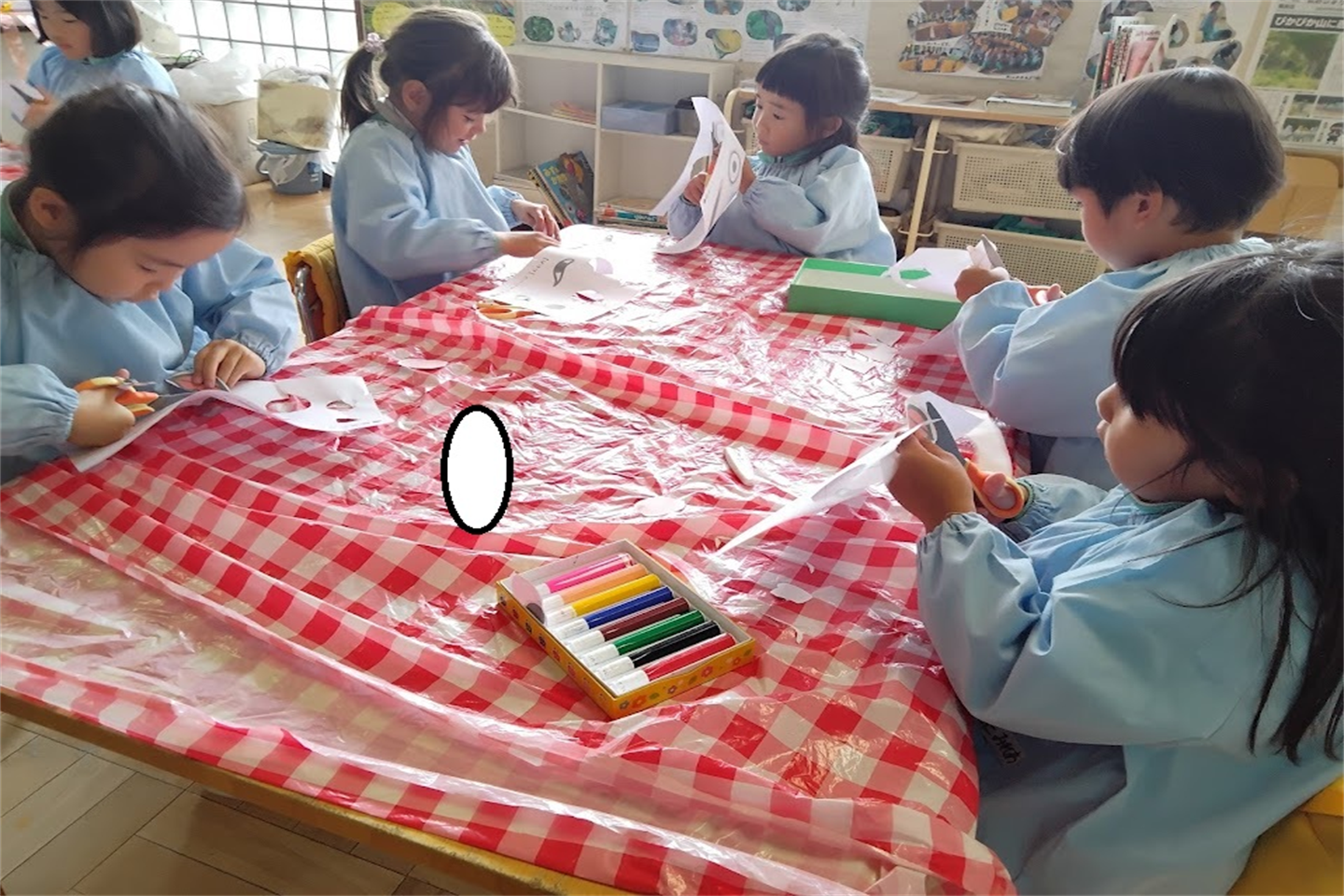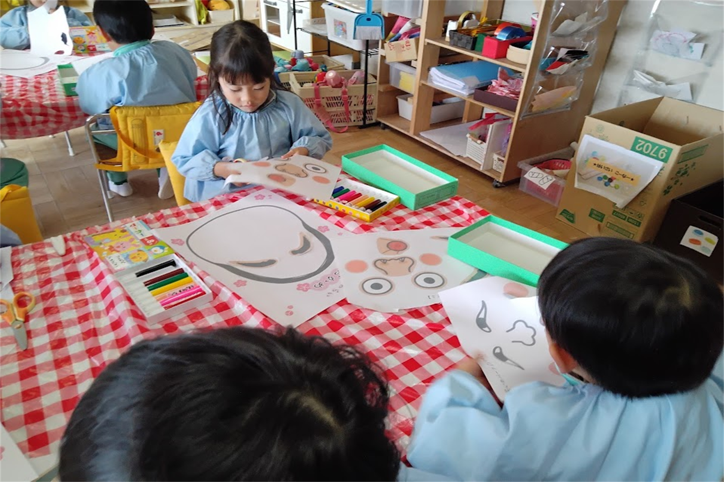 お友達とペアになり、目を隠す人・パーツにのりをつける人に自分達で分かれ友達と協力して行いました