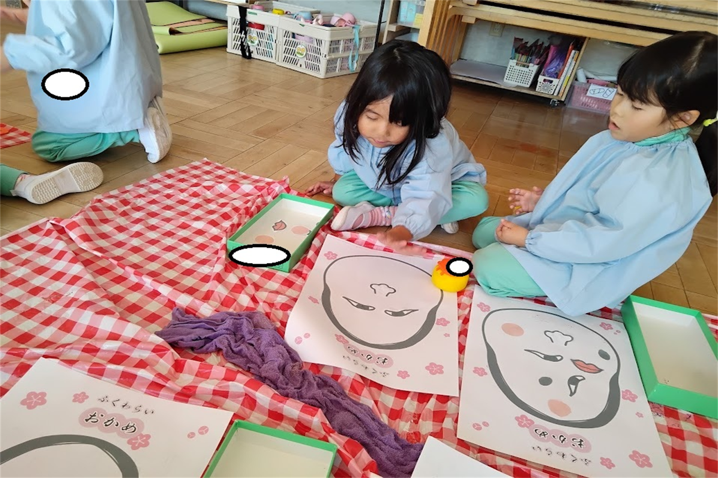 お正月遊び”福笑い”を行いました。「福笑いって何?」と不思議そうな子ども達。