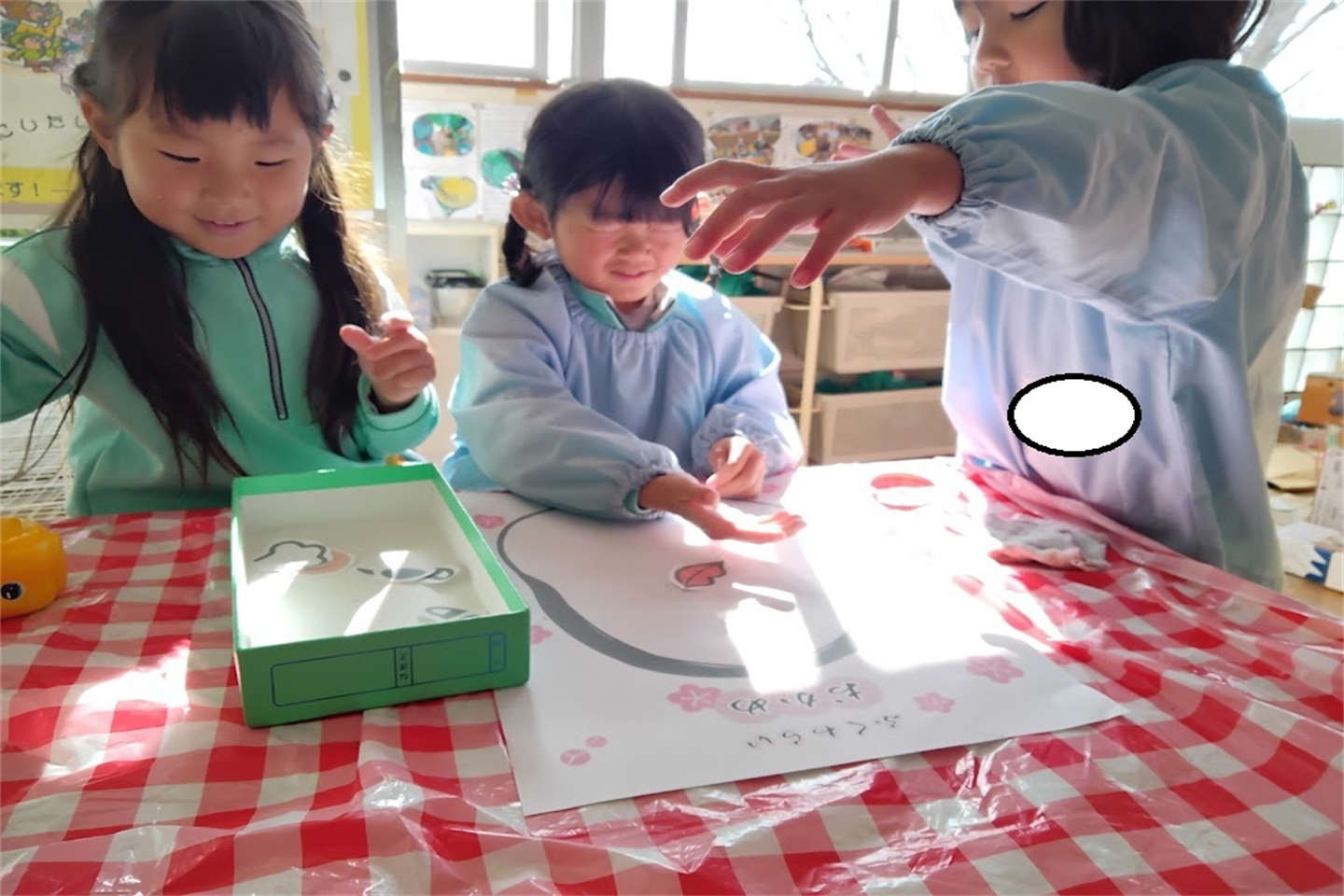「まずどれから貼りたい?」「どうぞ~どこにつくかな?」と優しく話をしながら遊ぶ姿や面白い顔になってくると友達と笑い合いながら楽しく製作する事が出来ました