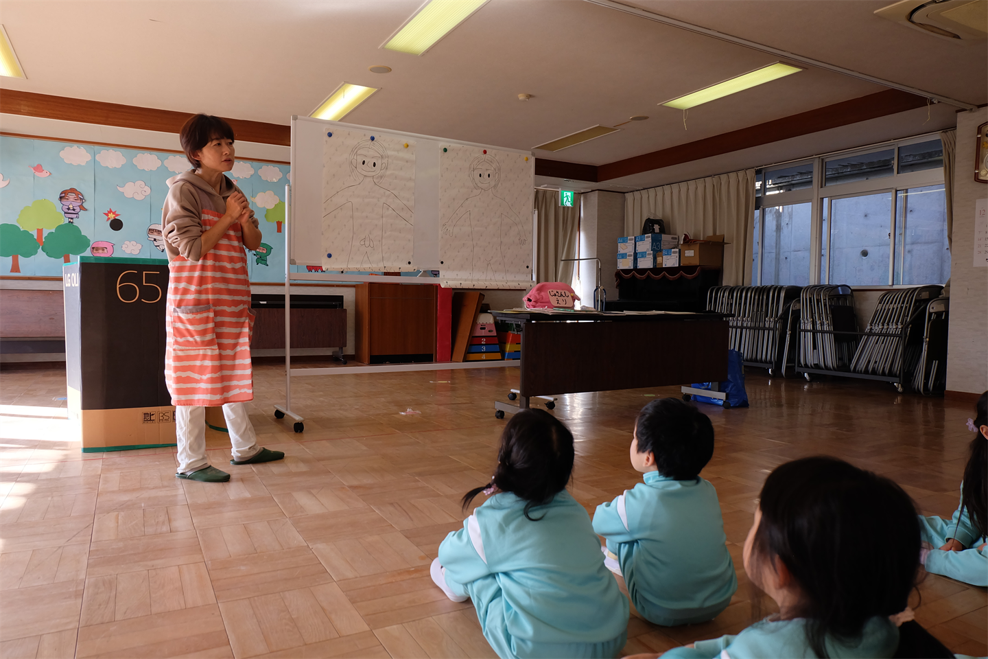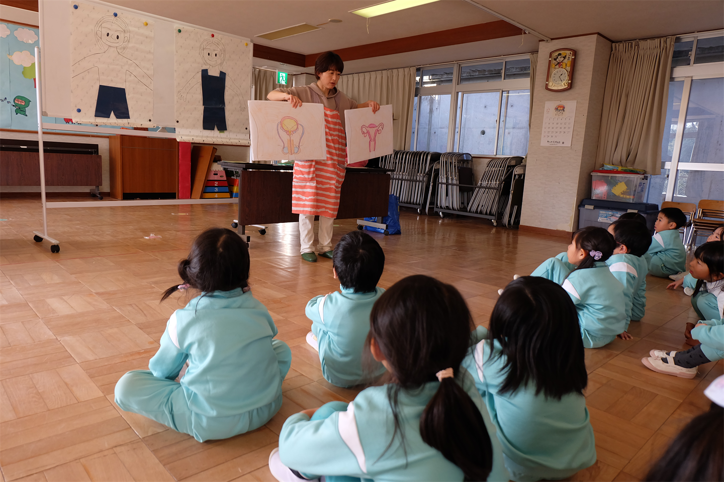 今日は豊田市の助産師さん えり先生が講師となり、命と性のお話し会を行い、年長児・年中児が参加しました。