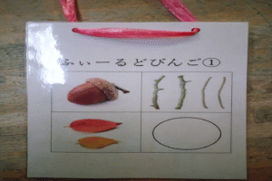 今回は「どんぐり」「枝」「葉」「丸いもの」の4つを探しました。