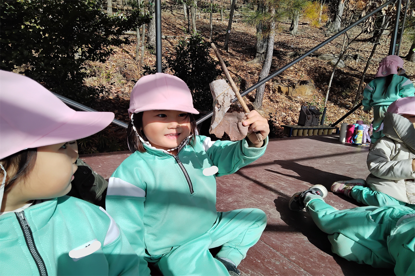 最後はテラスに集まって拾ったものをお友達同士で見せ合いました!特に「丸いもの」はどんぐりの帽子や石などを拾っており、子どもたちの感性が光りました