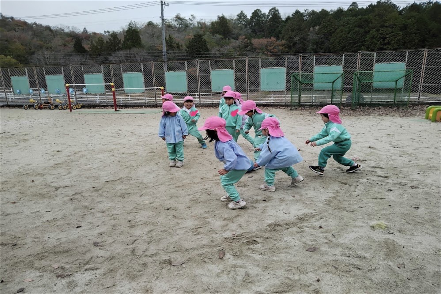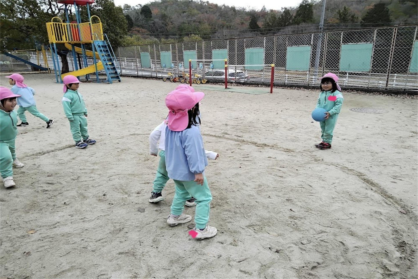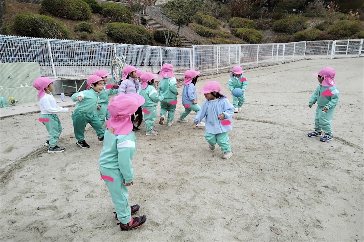 丸の中からはみ出さないようにしながらボールから逃げることを意 識して楽しみ、自分が転がしたボールが友達に当たると「 やったー!」と嬉しそうにする姿も見られました