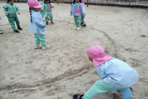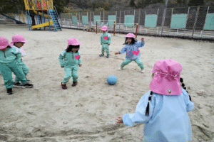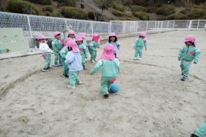 はじめは保育者がボールを転がし、 当たったら外に出るというルールで楽しみましたが、 慣れてくると子どもたち自身がボールを転がして遊びを進める姿が 見られました