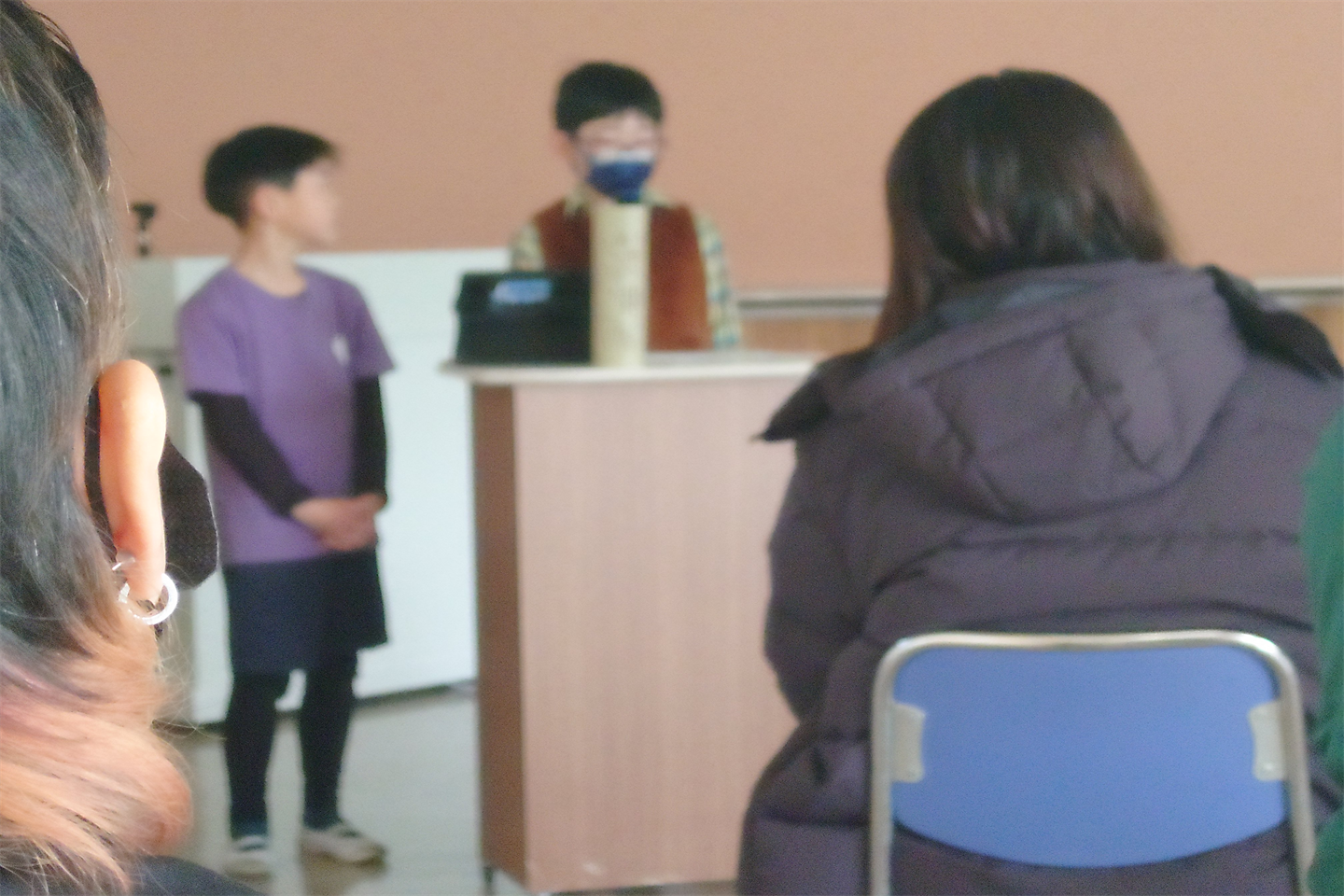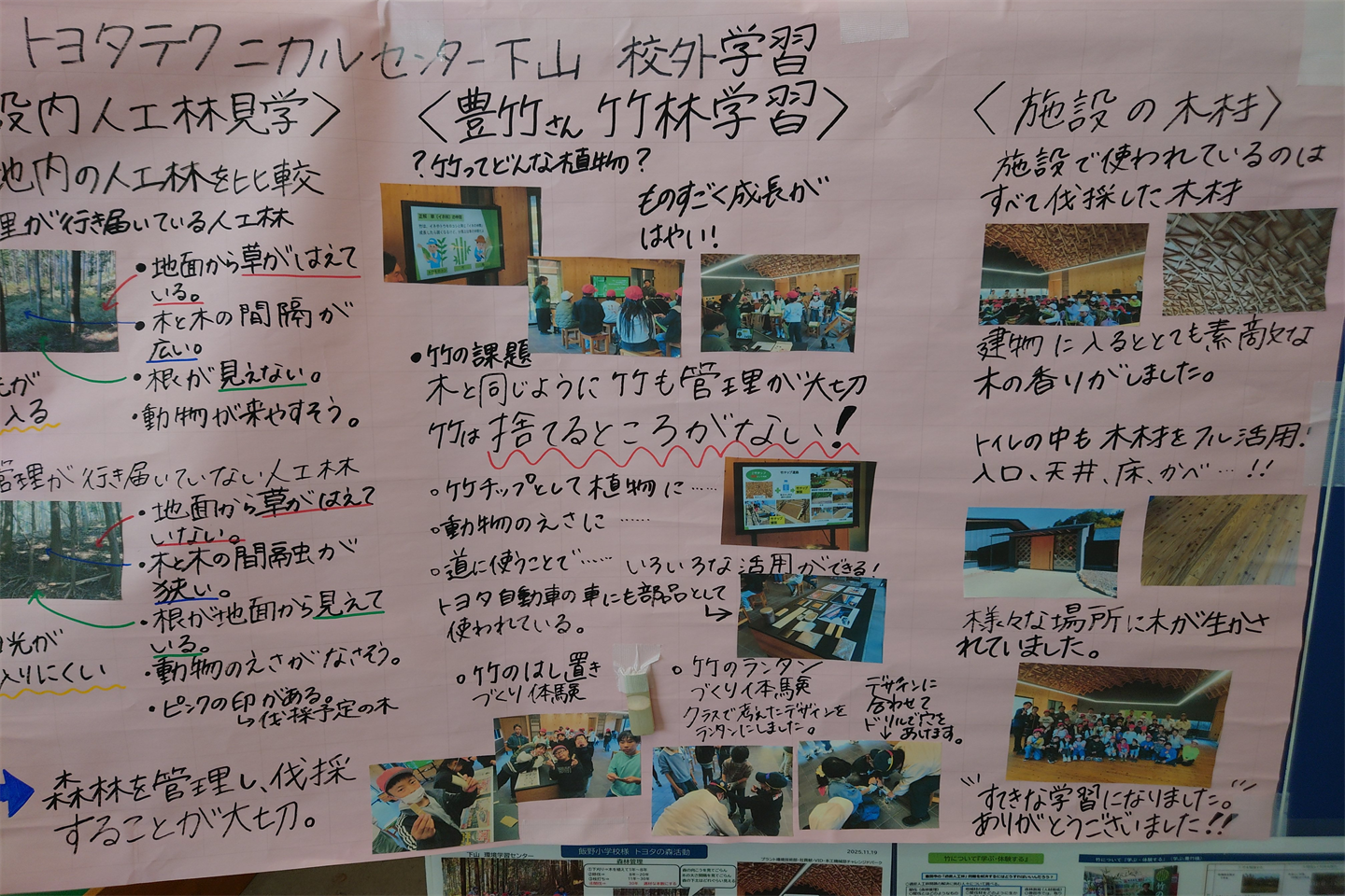 発表の様子からは、内容の深まりだけでなく、学びの「かたち」そのものがおおきく変化していることも感じる取ることができた。一人ひとりがタブレット端末を活用し、調べた情報や考えを整理しながら発表資料を作成し、仲間と共有する姿が見られ、子どもたちの学習環境が確実に進化している事を実感した。デジタル機器は、単なる道具ではなく、思考を可視化し、学びを深めるための有効な手段として自然に学習の中に位置づいていた。私が特に関わらせていただいたのは、9班「竹の育ち方を小さな子にも伝えたい」というテーマである。児童の学びをさらに発展させるための助言を求められた際、「実際に幼稚園児に向けて、今日の学習発表会を伝えてみる」という実践的な提案を行った。知識を蓄積する段階かっら、それを「誰かに伝える」段階へと移行する事で、学びはより主体的で深いものとなる。他班においても、絵本の作成やプロジェクターを用いた説明など、対象に応じた表現方法が工夫されていたことから、皆で実勢にやってみる場を設け、提案・実行・体験を通して学びを確かなものとした。