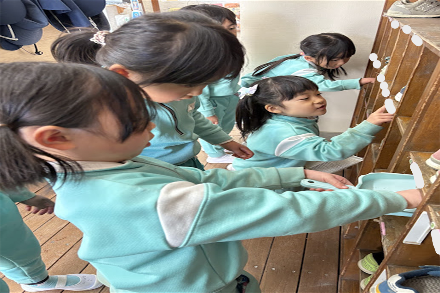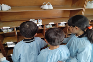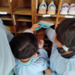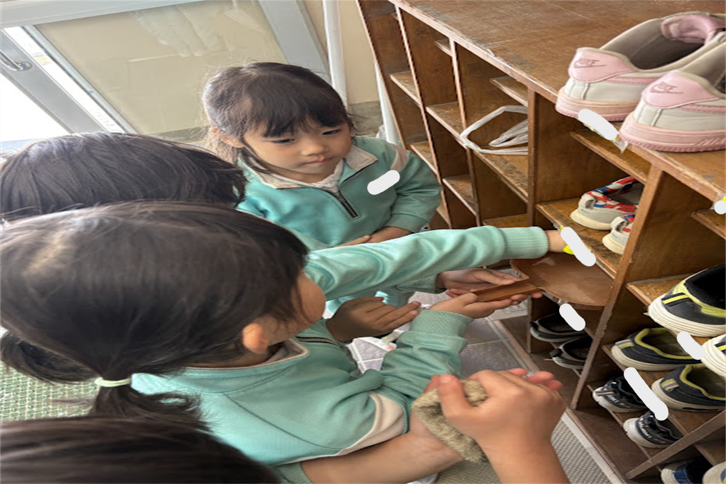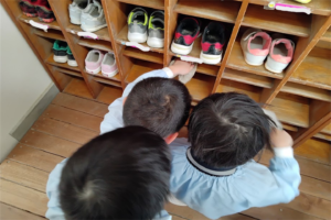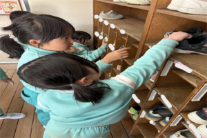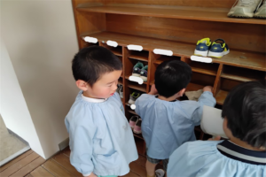 今月は年長さんが行っていた下駄箱掃除を年中さんに引き継ぎしました黒ハート