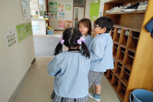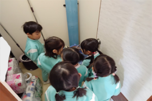 年中組さんも始めは不安そうでしたが、最後には「こうでしょ?」などと自信をもって掃除する姿があり、掃除後にこども会議を行ってみると、「大変だった!」「楽しかった!」「またやりたい!」と様々な感想が出ていい機会になりましたうれしい顔指でOK