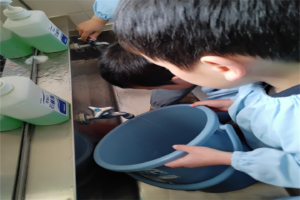始めの1段目は年長組がほうき・ぞうきんのやり方を伝え