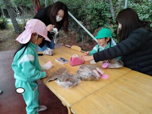 テラスではぴかぴか山にある落ち葉🍂を使ってフクロウ🦉やウサギ🐰を製作