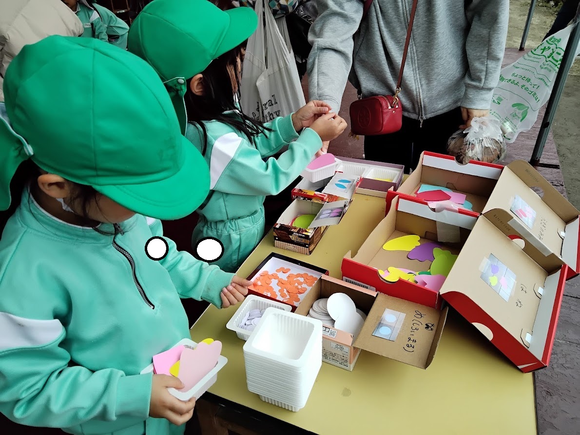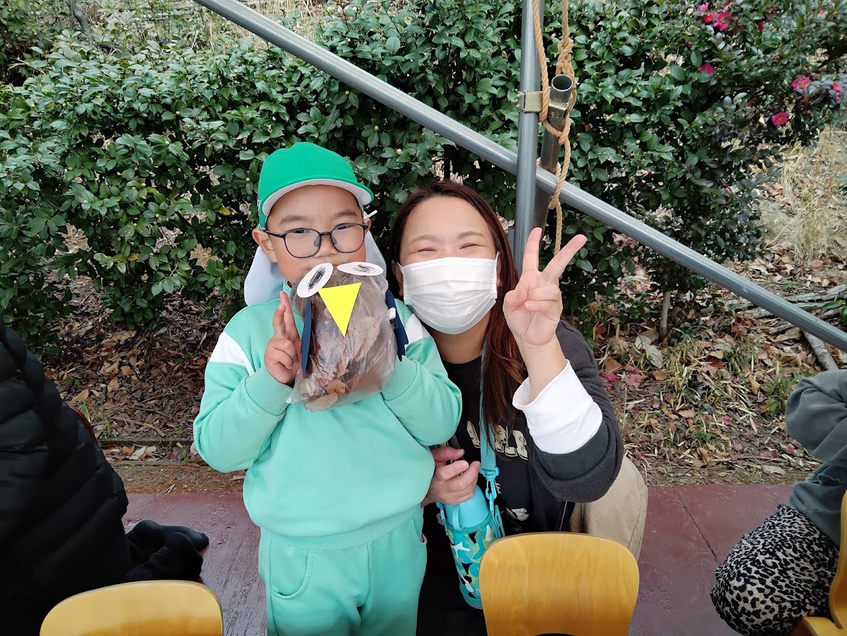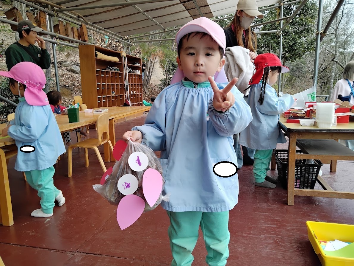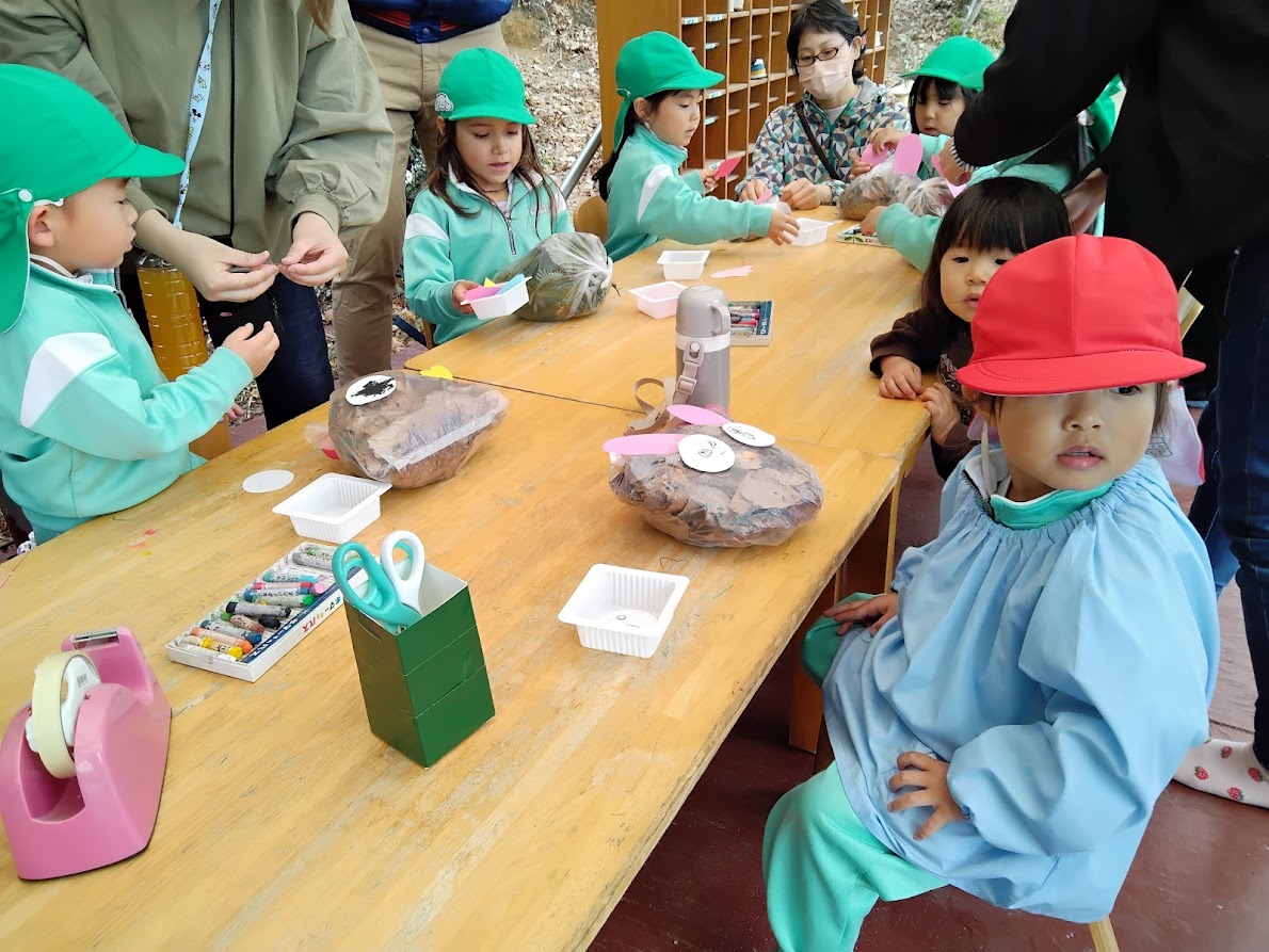 テラスではぴかぴか山にある落ち葉🍂を使ってフクロウ🦉やウサギ🐰を製作