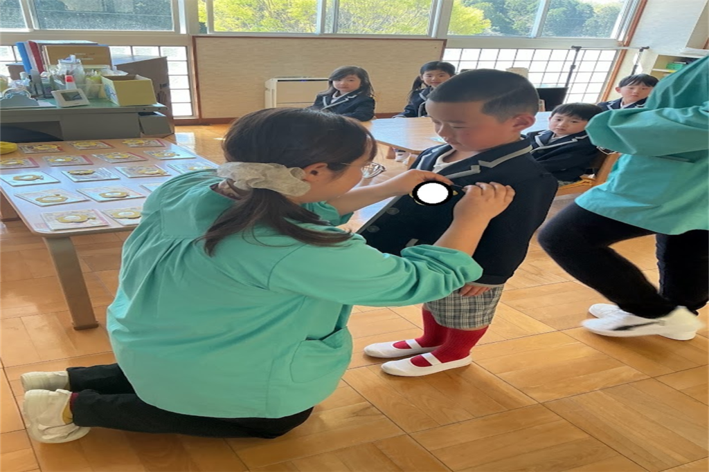 先生からピカピカの名札、カラー帽子をもらい大喜び