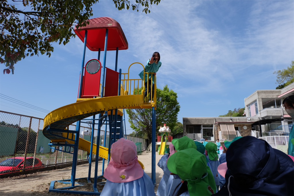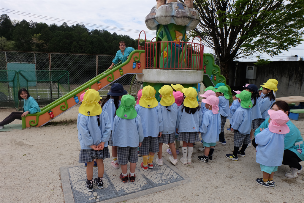 「どうやって滑り台を滑るのかな」「友達を待っている時はどこに並ぶのかな」などお話をしながら正しい使い方を知る事ができました